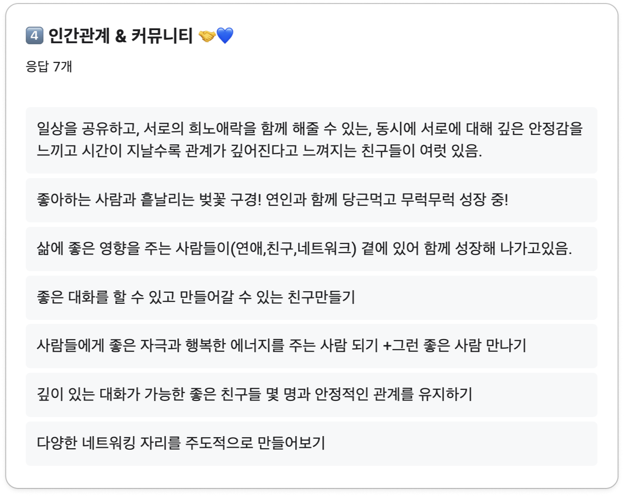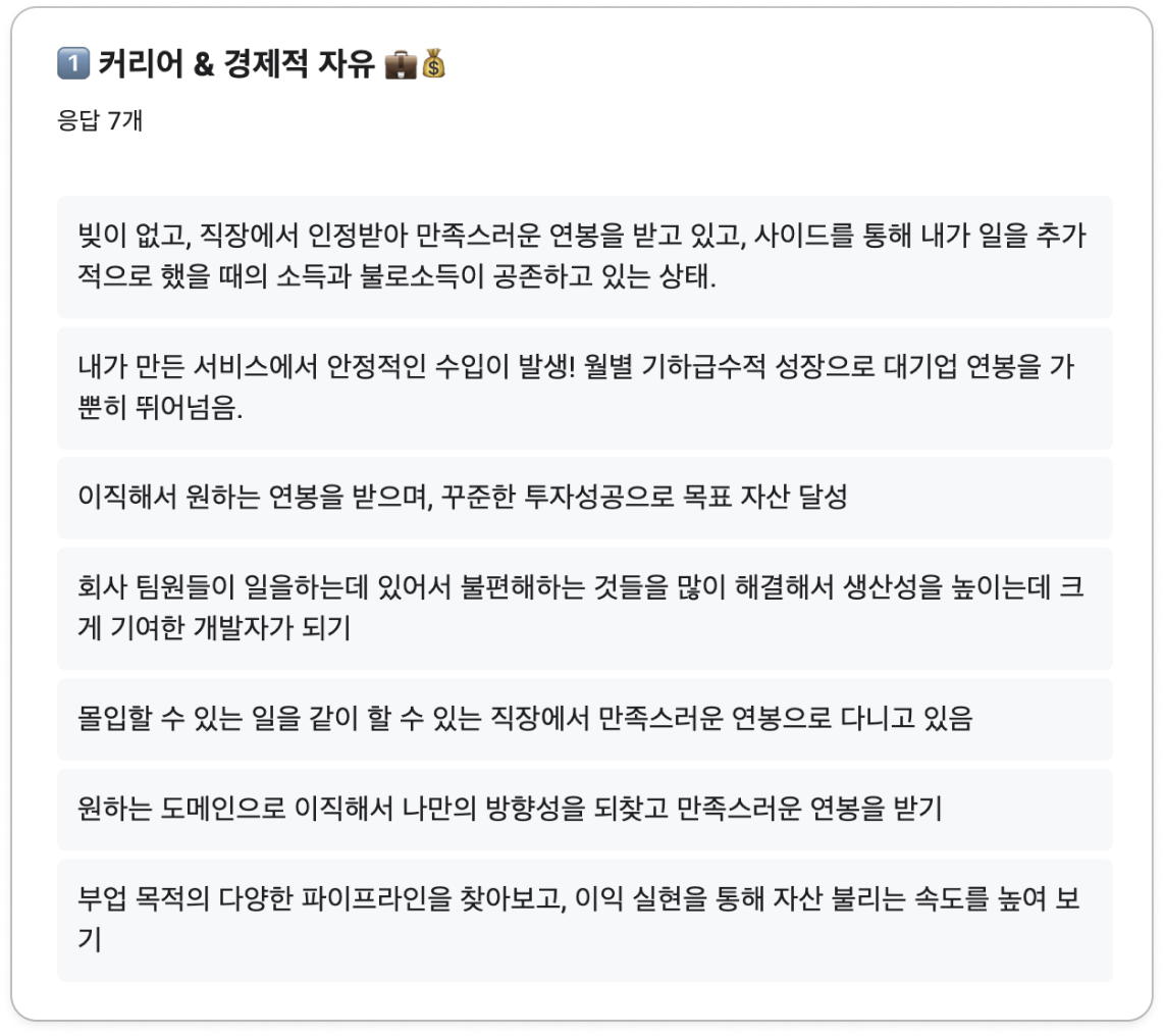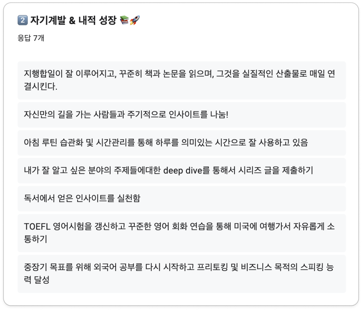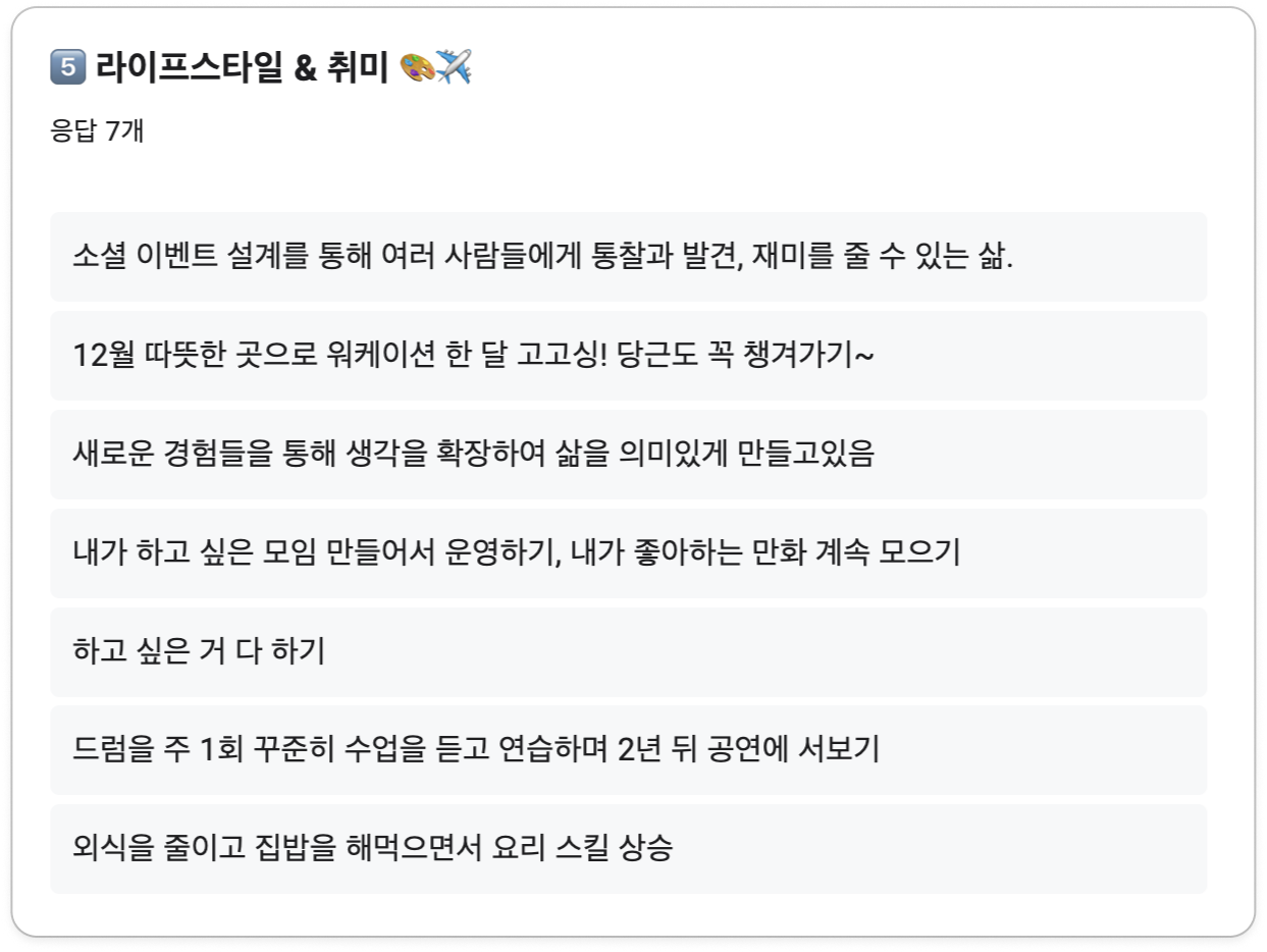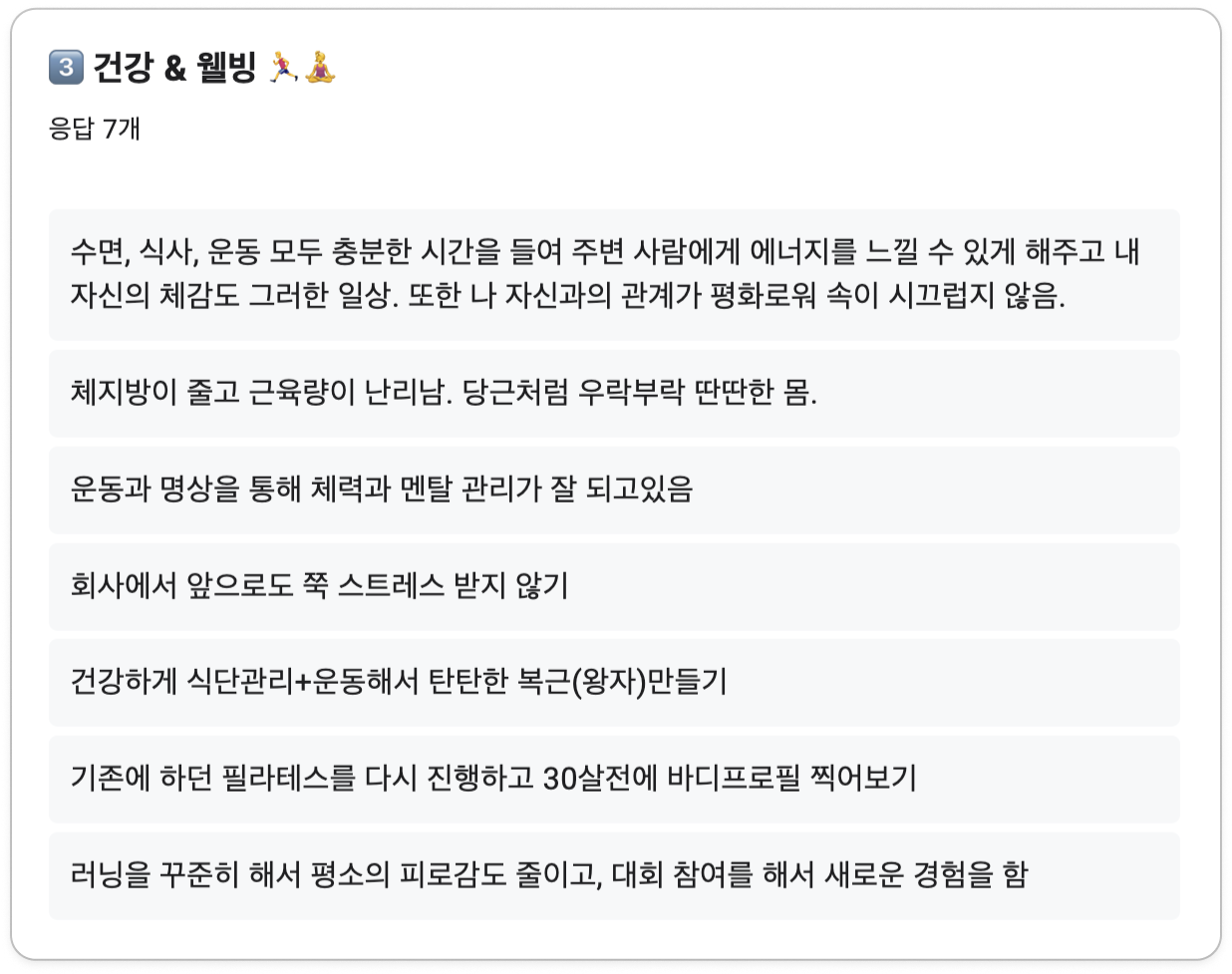 각 카테고리에 대해 2025년 자신이 원하는 모습을 한 문장으로 작성해 달라고 설문을 돌렸습니다. (여러분도 한 번 생각해 보세요~😉)
