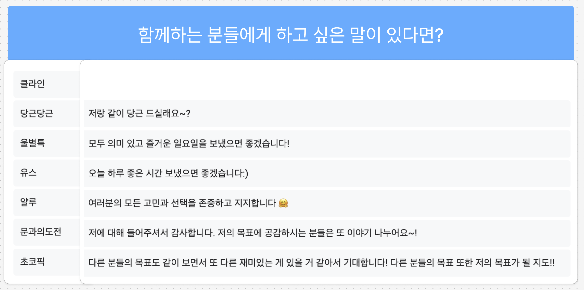 모임 시작 전 서로에게 하고 싶은 말을 남기기도 했어요. 🤭