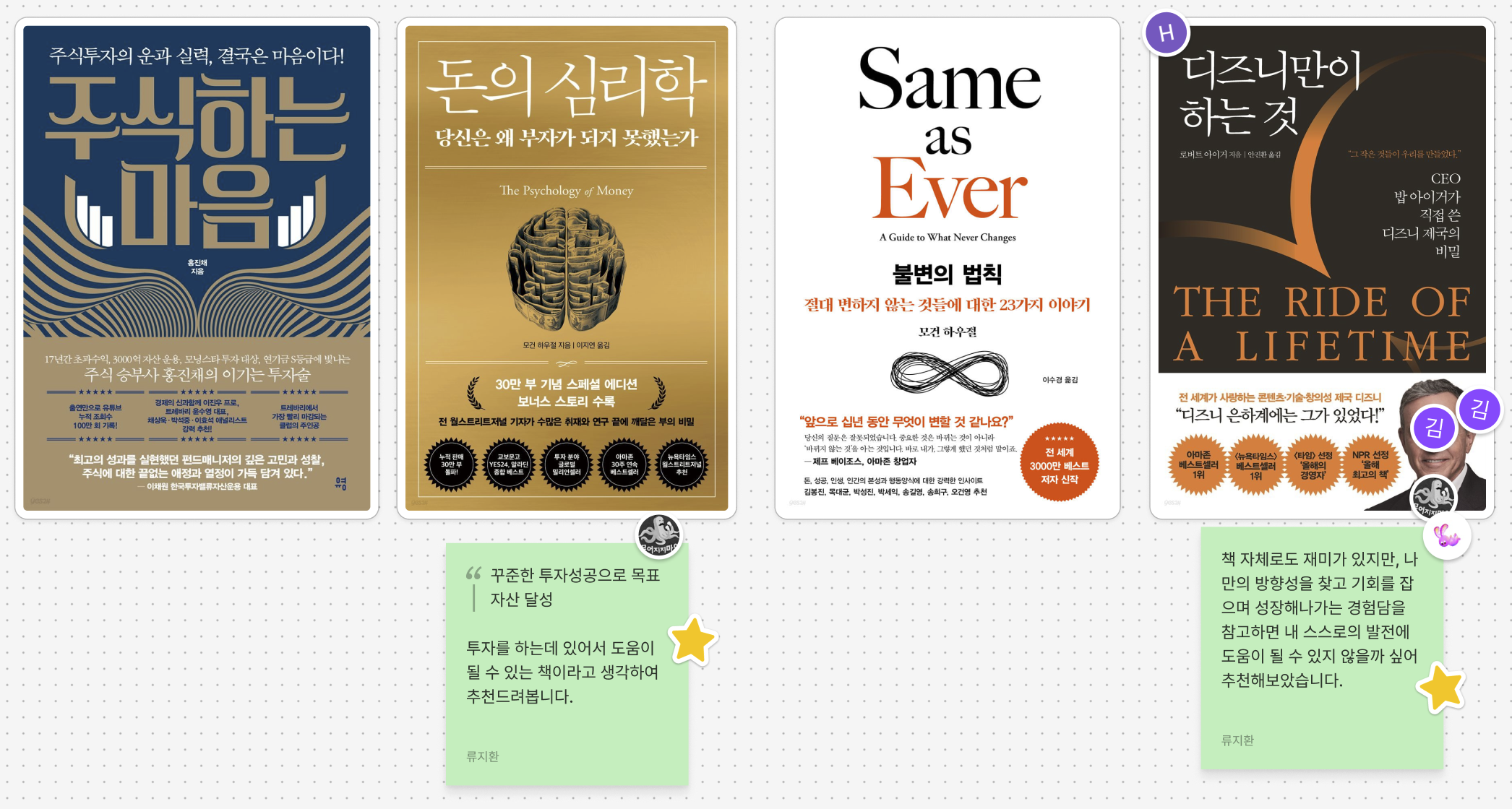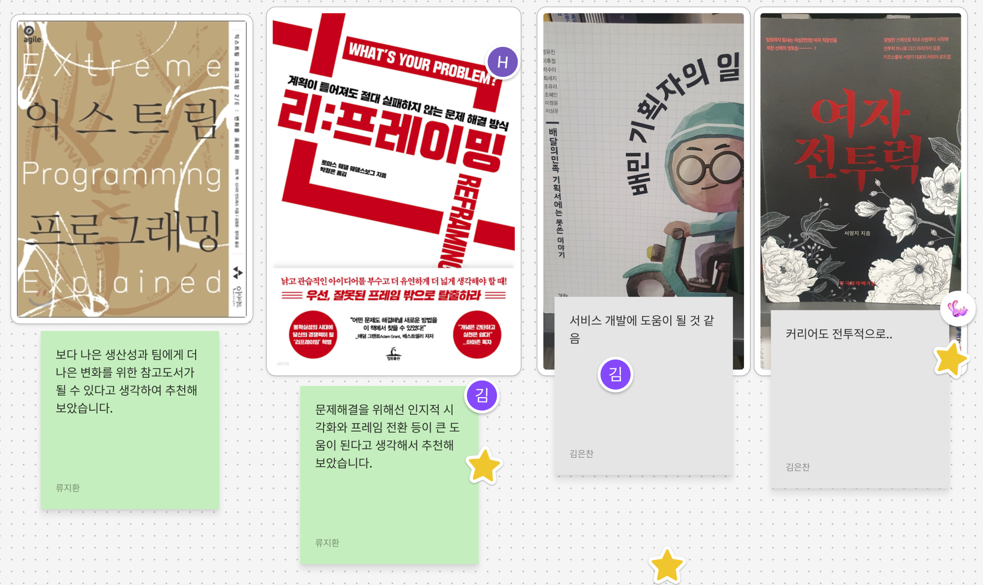 약 1시간 동안 각자 책을 찾은 후에 모임 장소로 향했습니다. 지난 모임에서는 슬랙에서 책을 공유하고 소개했었는데 이미지 공유나 내용을 적기가 불편하더라고요. 그래서 이번에는 피그잼을 이용해 한눈에 볼 수 있도록 준비했습니다.