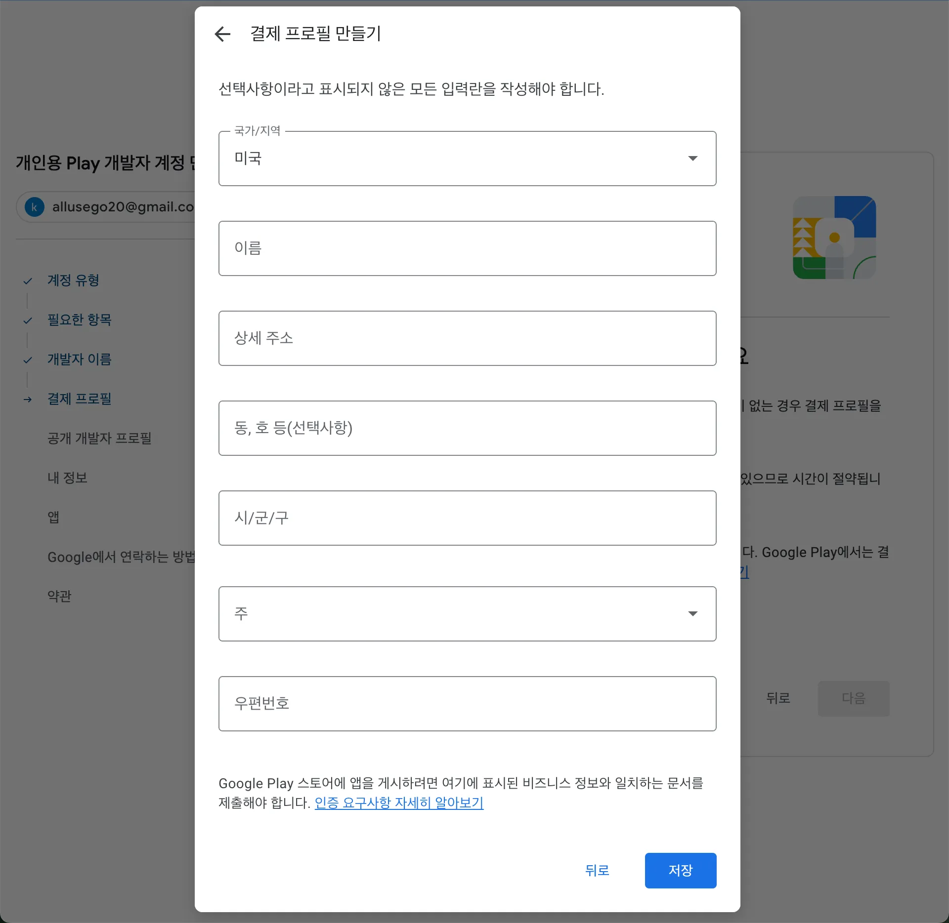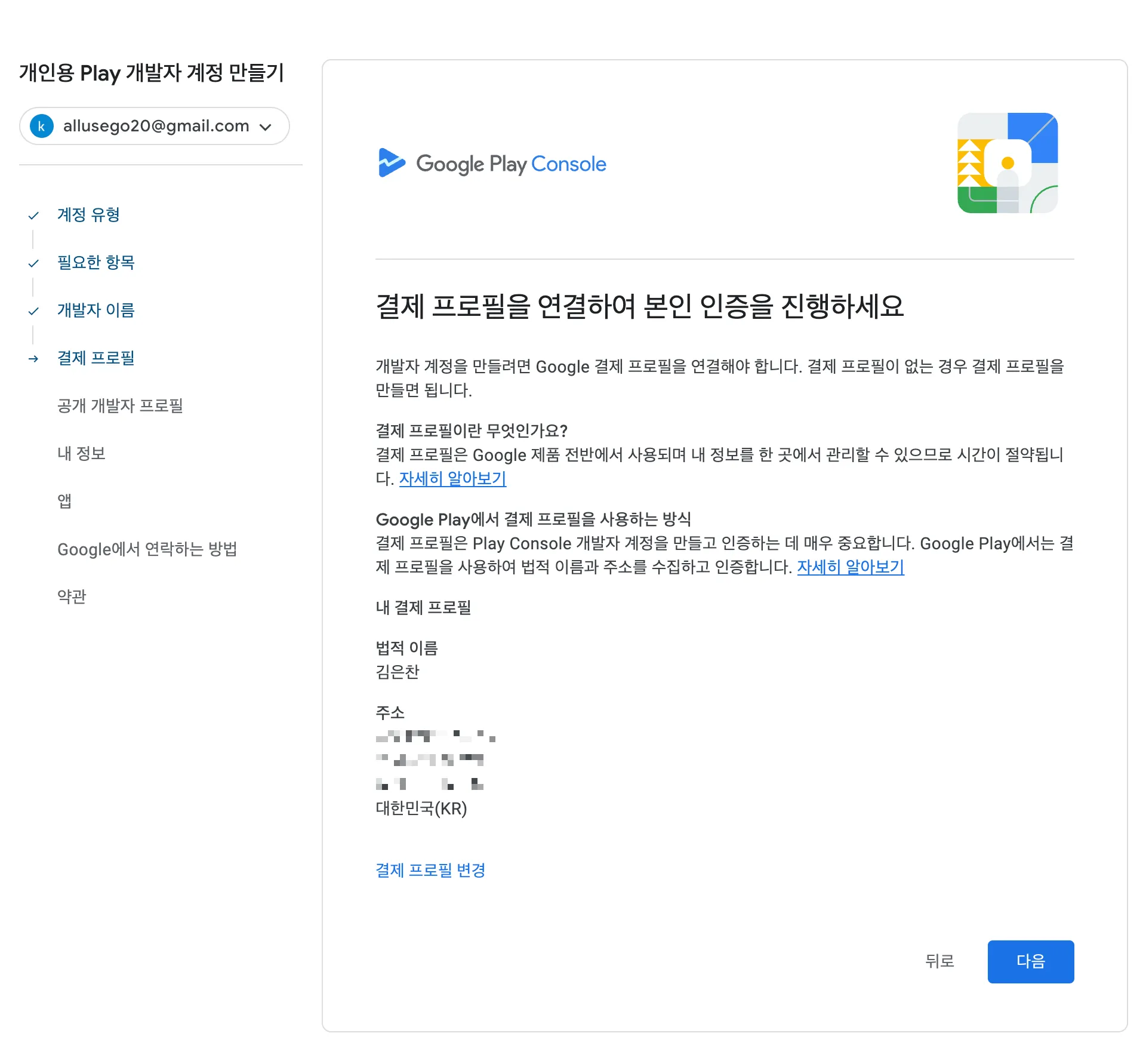 *개발자 계정을 등록 후 본인 인증을 위해 이름과 주소를 포함한 서류를 요청할 수 있습니다. 예) 공과금 고지서, 임대 계약서 등