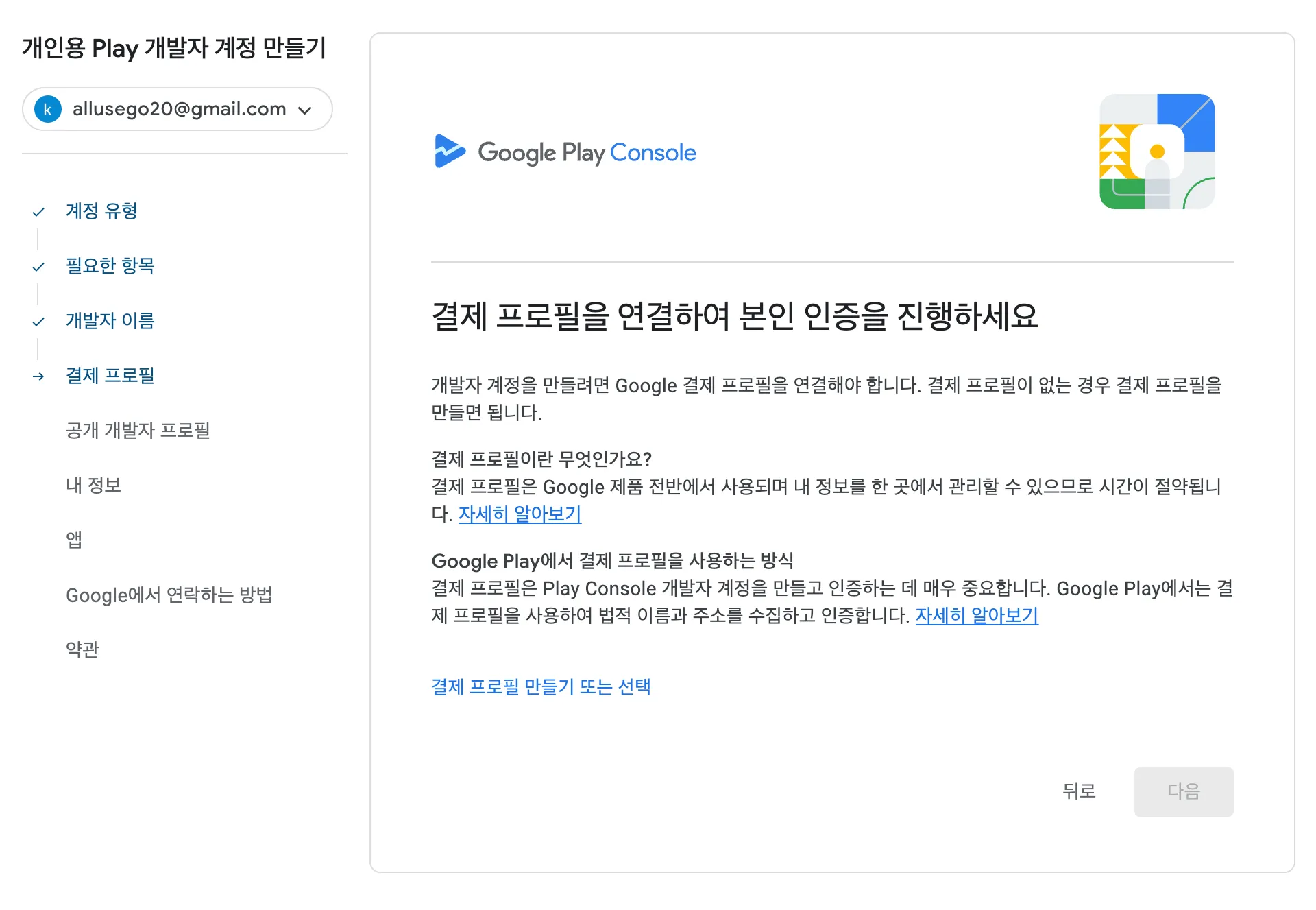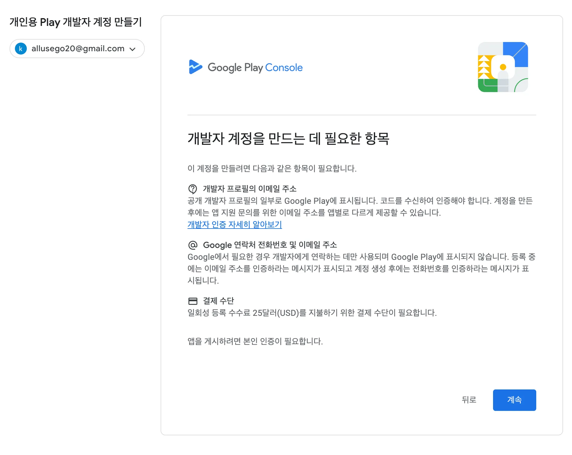 Google에서 신원을 확인하는데에 며칠이 소요될 수 있습니다. 그러니 개발자 계정을 만들고 바로 진행하는 것을 권장합니다.