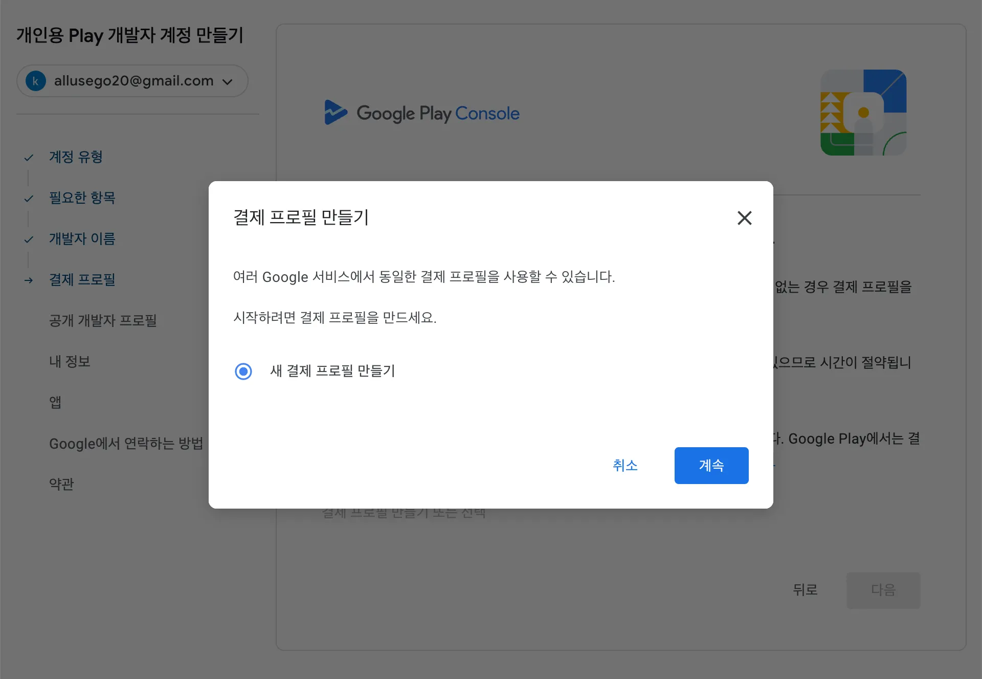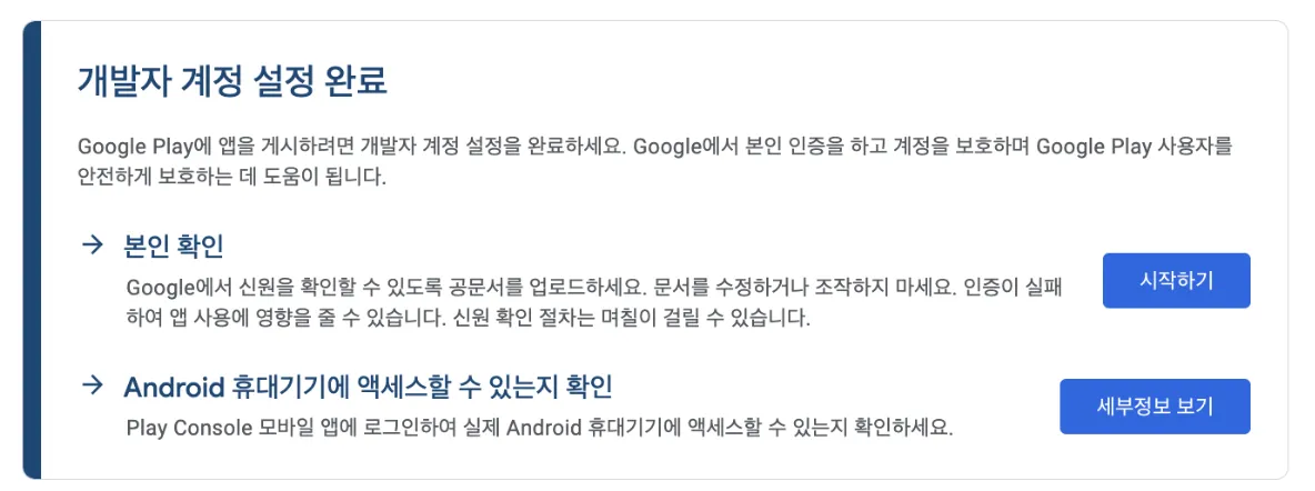 개발자 계정을 만들었어도 ‘개발자 계정 설정’을 완료해야 앱을 출시할 수 있습니다.