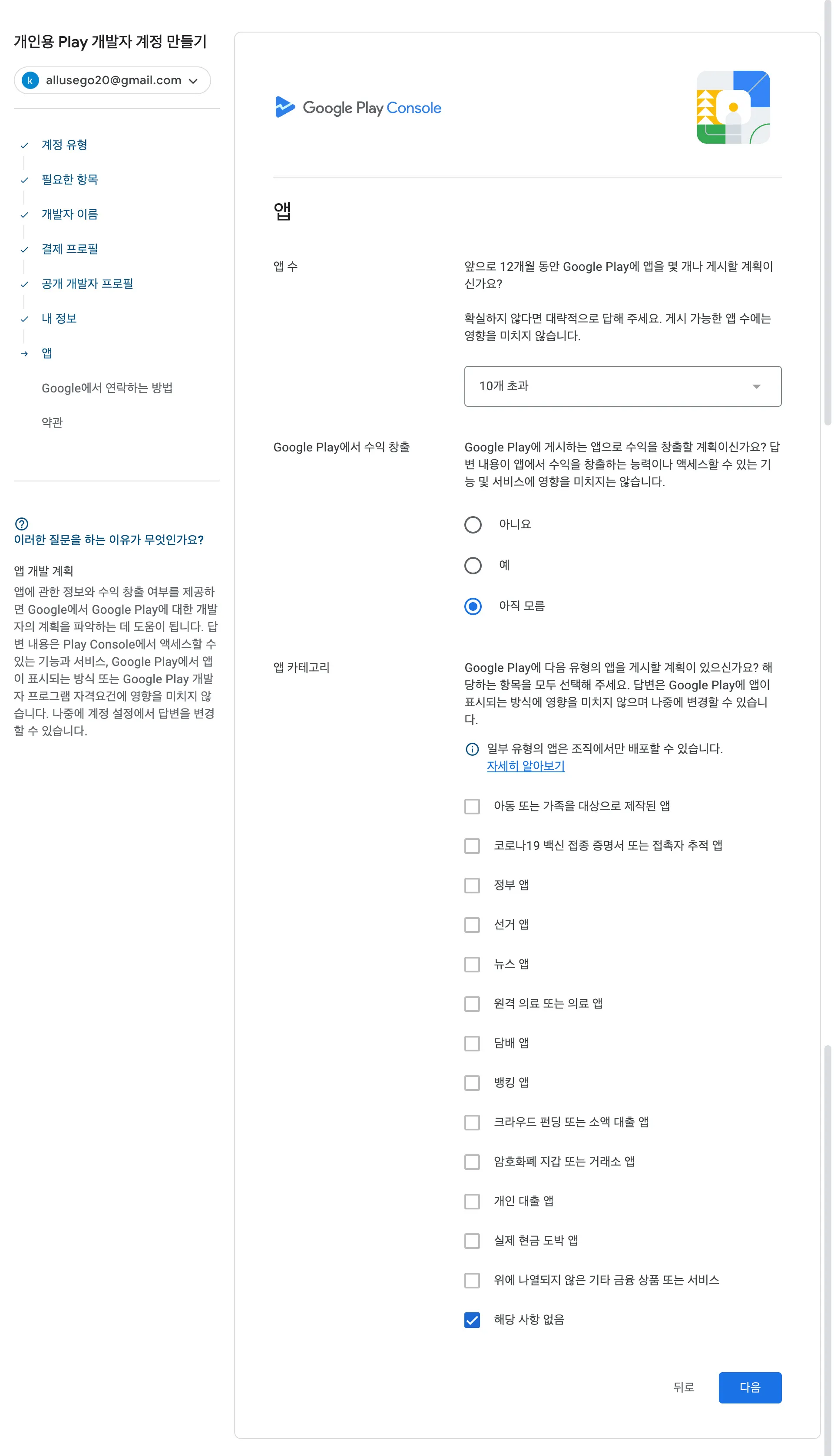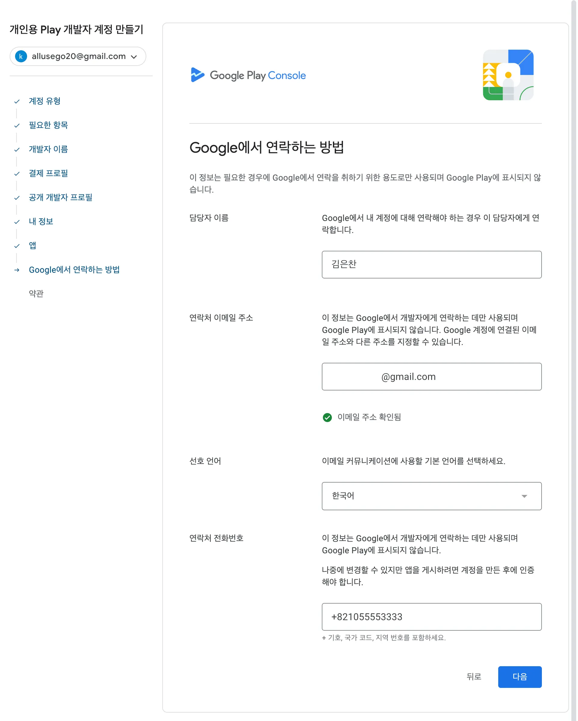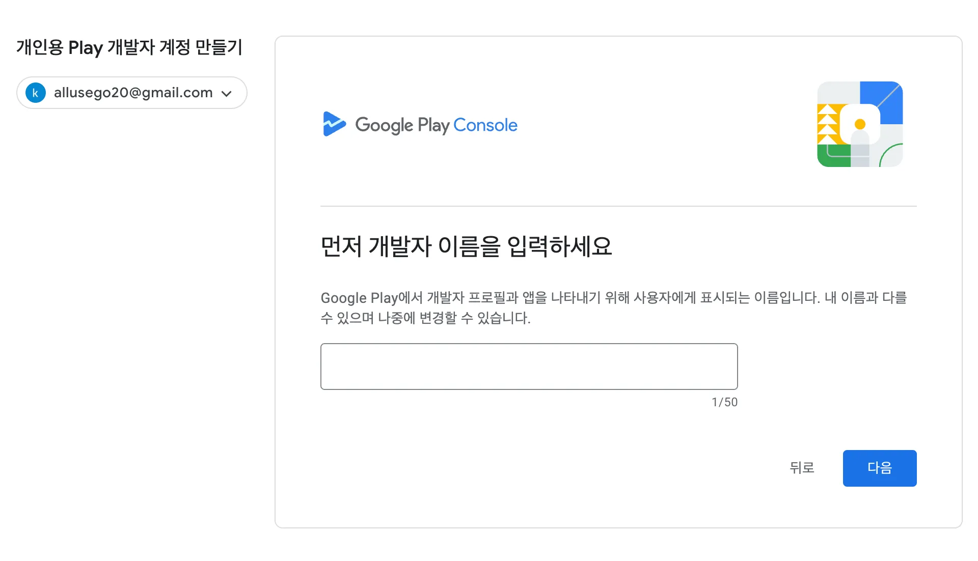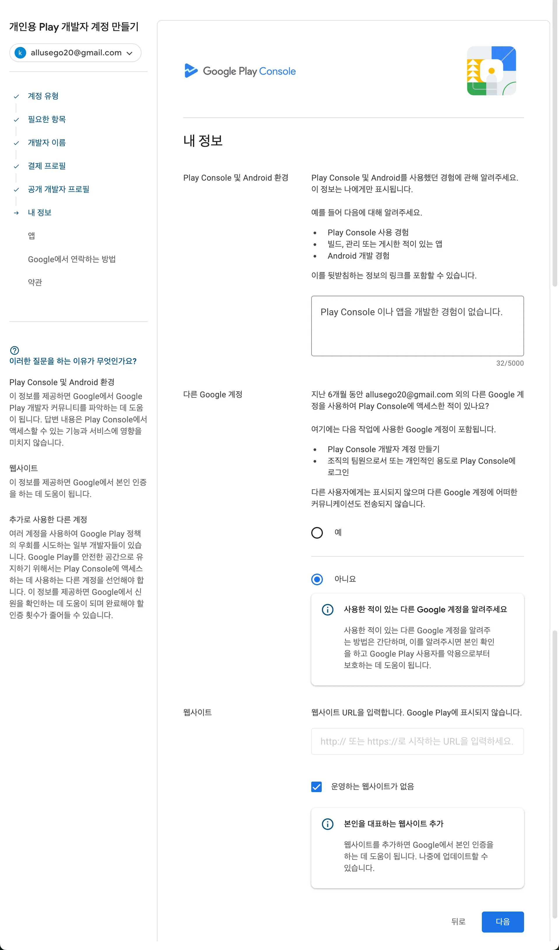 만약 Play Console 사용 경험이 있거나, 다른 구글 개발자 계정이 있다면 입력해주세요.