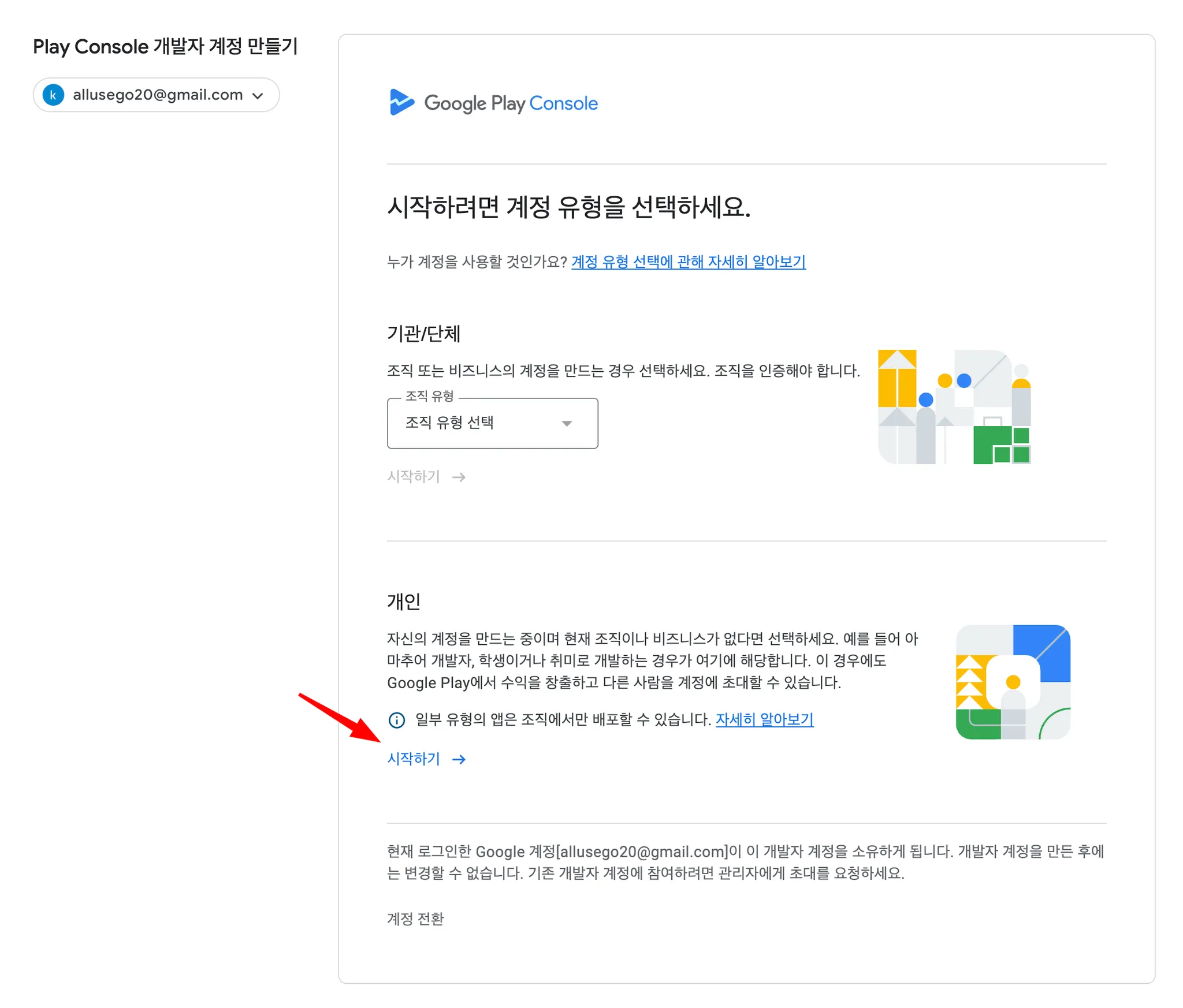 [개인] 에서 시작하기 버튼을 눌러주세요.
