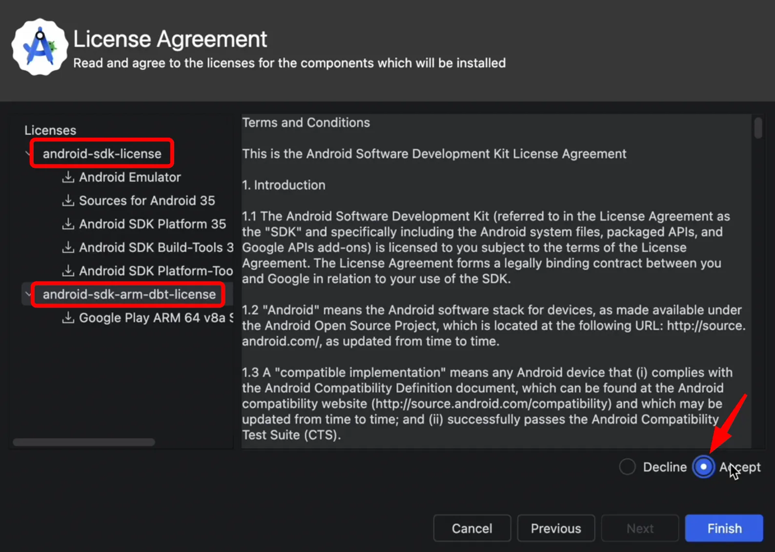License Agreement 화면에서 android-sdk-license 와 android-sdk-arm-dbt-license 을 선택하여 모두 Accept 옵션을 선택하고 Finish 버튼을 눌러줍니다.