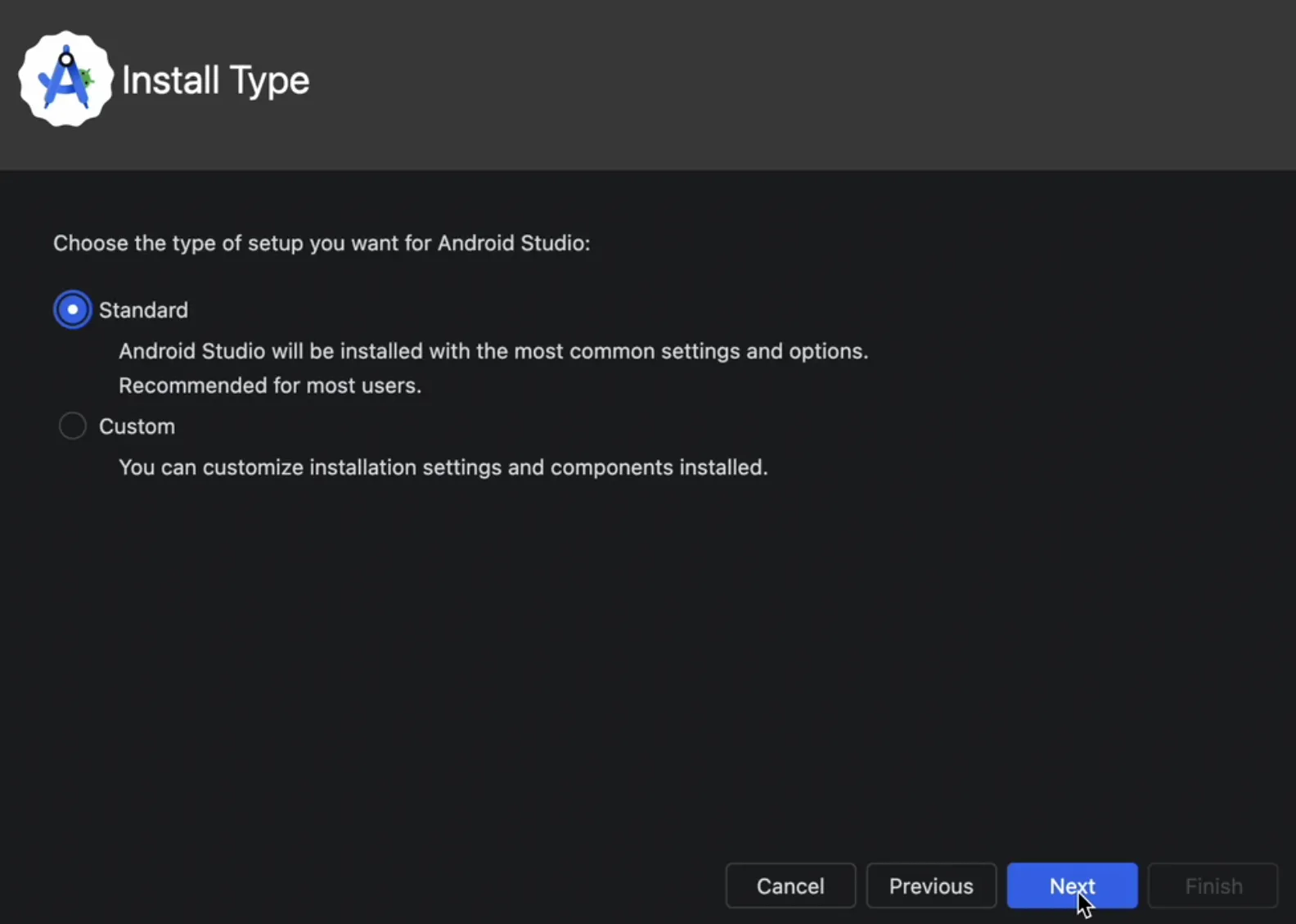 Install Type 에 Standard 옵션을 선택하고 Next 버튼을 눌러줍니다.