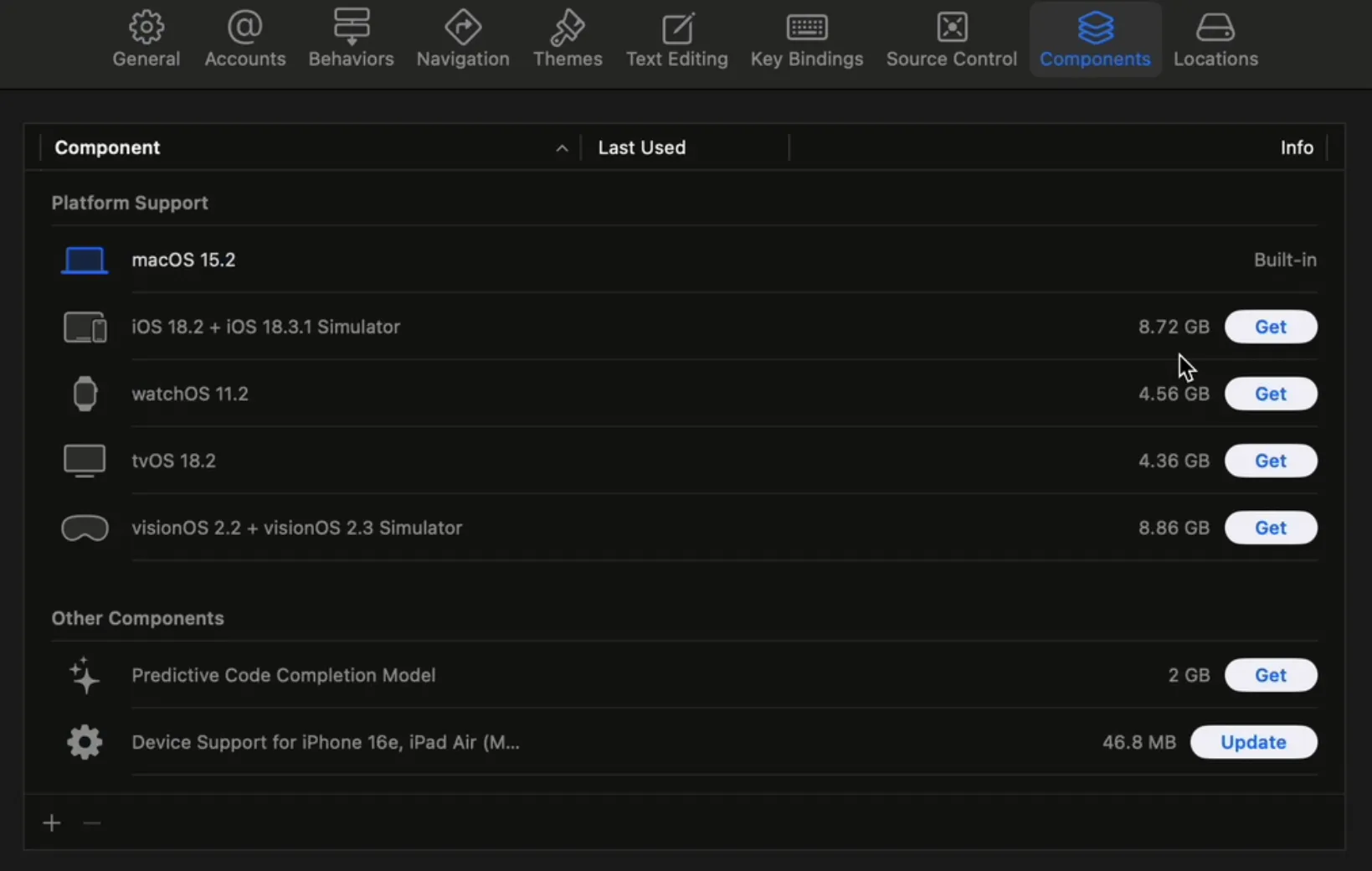 만약 iOS를 선택하지 않고 설치했다면, 추후 Xcode - [Settings] - [Components] 탭에서 추가할 수 있습니다. (아래 이미지 참고)