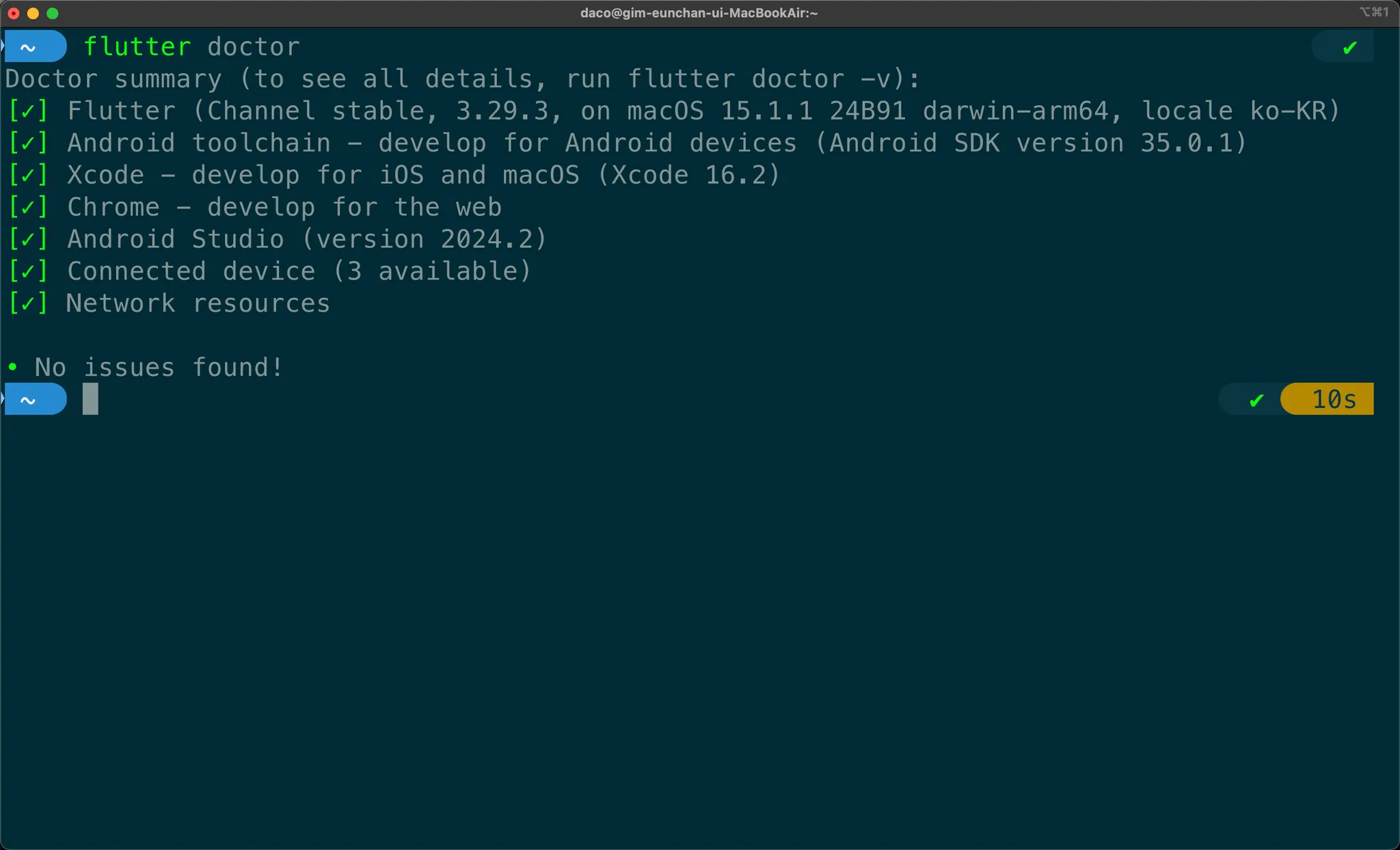 cocoapods 까지 설치를 완료했다면 다시 flutter doctor 명령어를 실행해 Flutter 개발 환경을 최종 점검합니다.