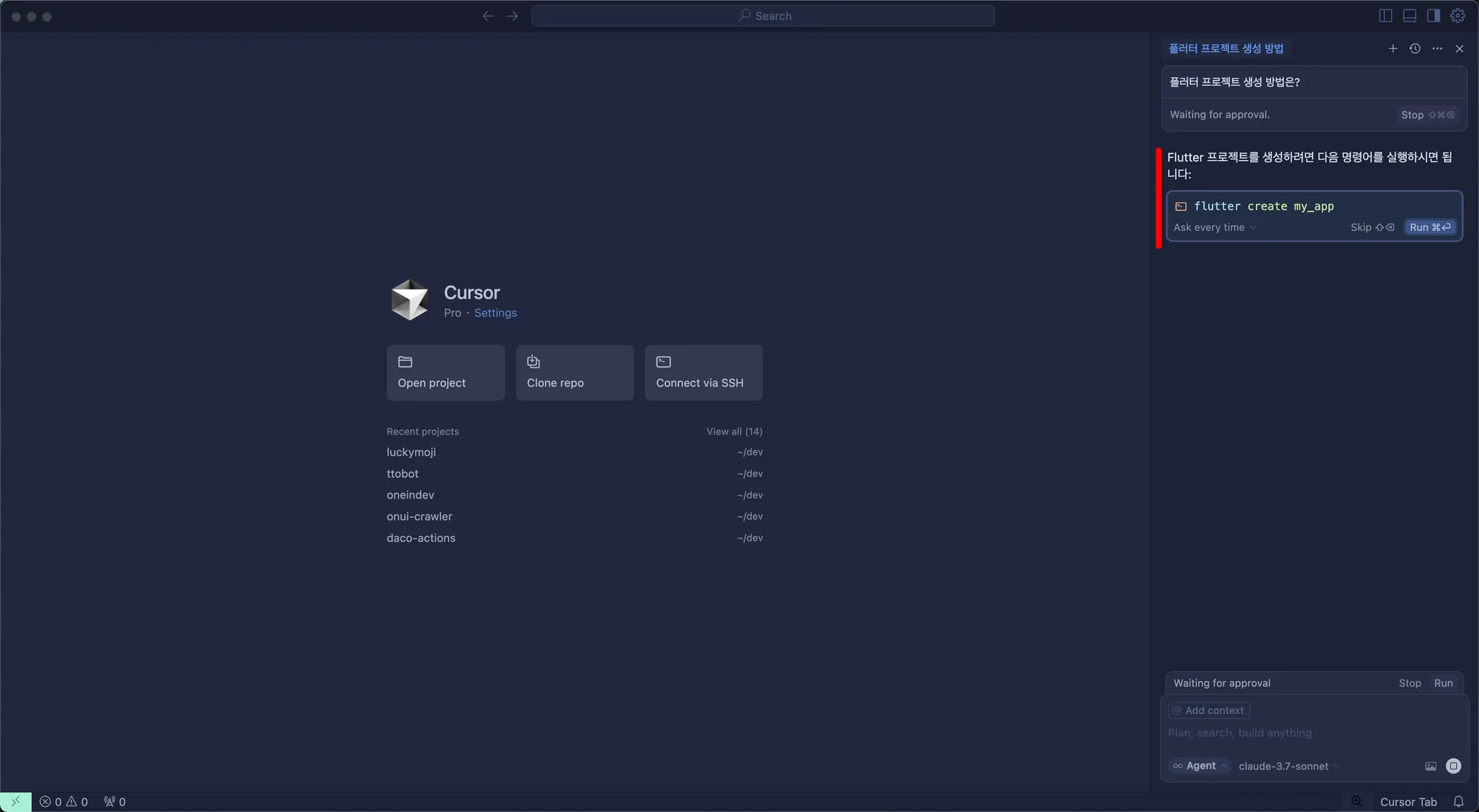 Cursor Settings 탭을 끄고 단축키 option + command + b 또는 command + l 을 눌러 우측 chat 화면을 열 수 있습니다.