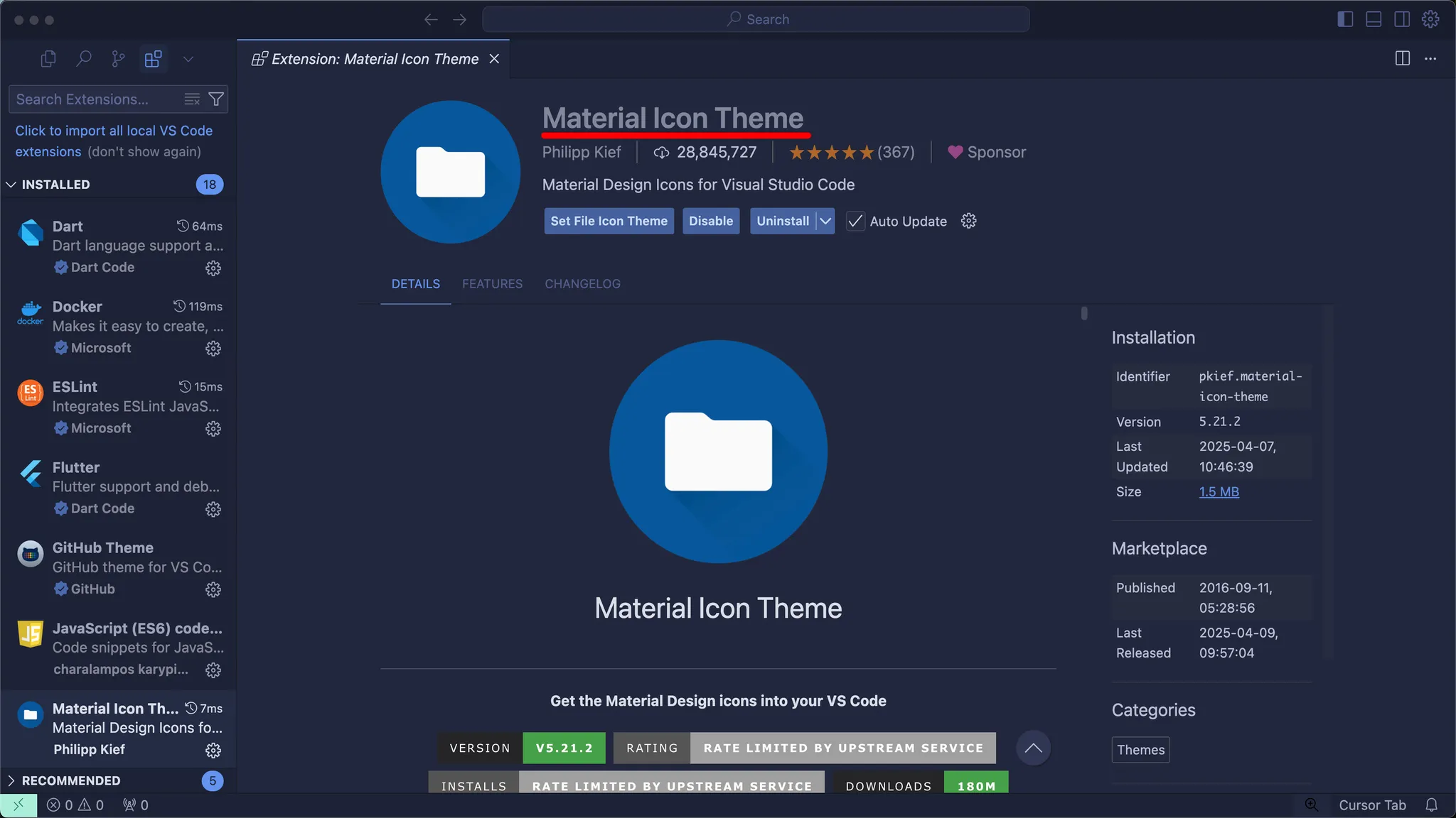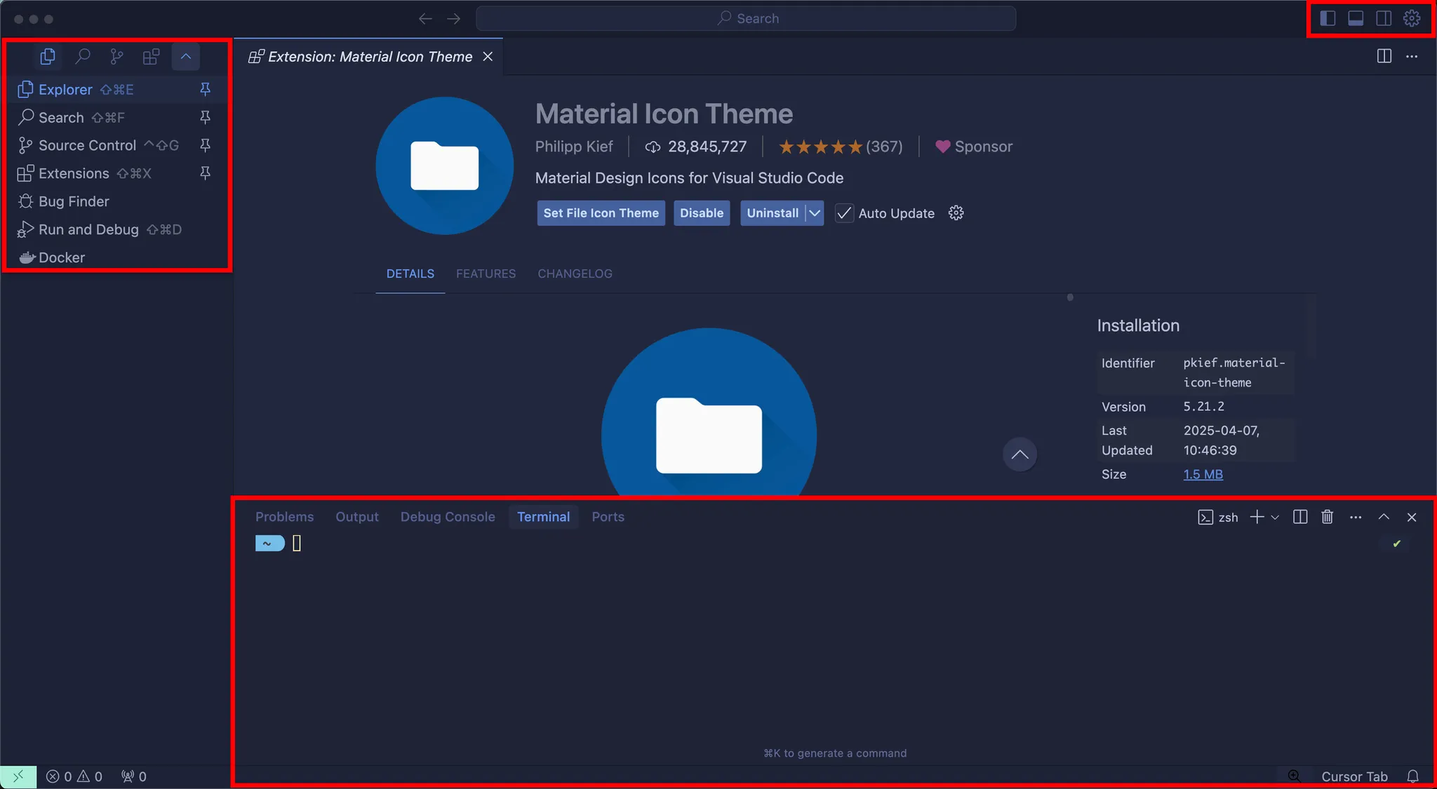Material Icon Theme 는 파일과 폴더를 아이콘으로 적용해주는 확장 기능입니다. 필수는 아니므로 생략가능합니다.