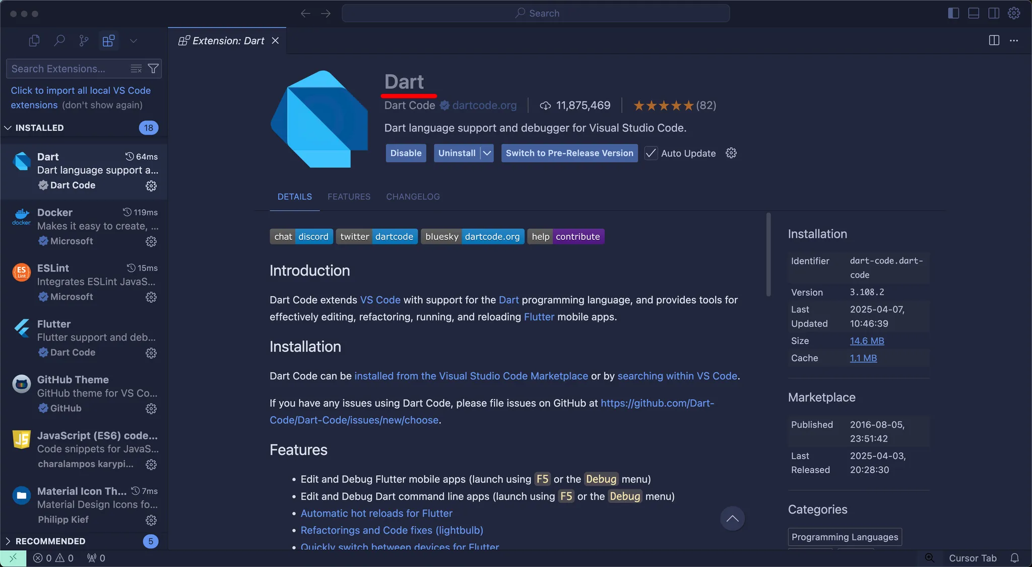 좌측 Extensions 검색창에 ‘Dart’ 를 검색하여 Dart 익스텐션을 설치해주세요.