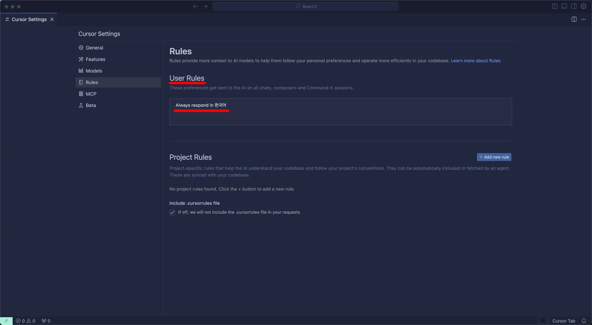 프로젝트 별로 Project Rules 를 지정할 수 있습니다만 현재 단계에서는 설정하지 않겠습니다.