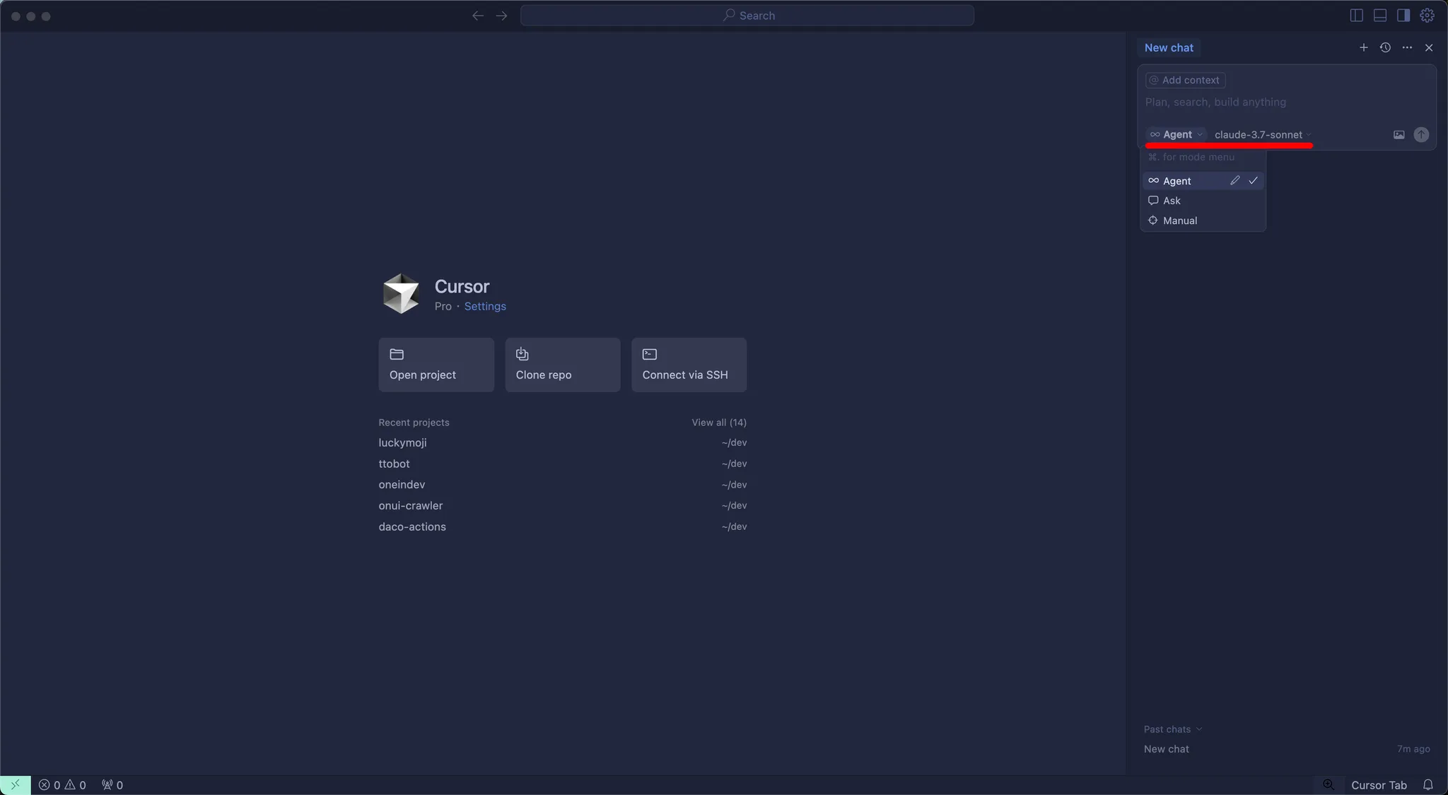 chat 옵션에는 Agent, Ask, Manual 이 있습니다. 이 옵션은 Cursor 업데이트 마다 약간씩 변경이 있을 수 있습니다.