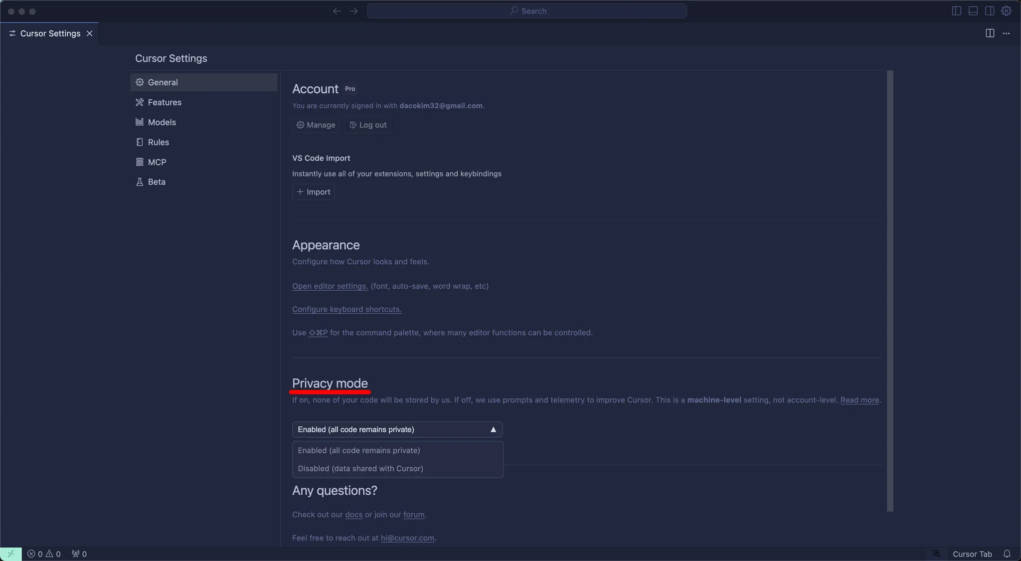 General 메뉴에서 Privacy mode 를 설정할 수 있습니다. Privacy mode 는 사용자의 코드를 외부 서버에 저장하거나 학습되지 않도록 설정하는 기능입니다.