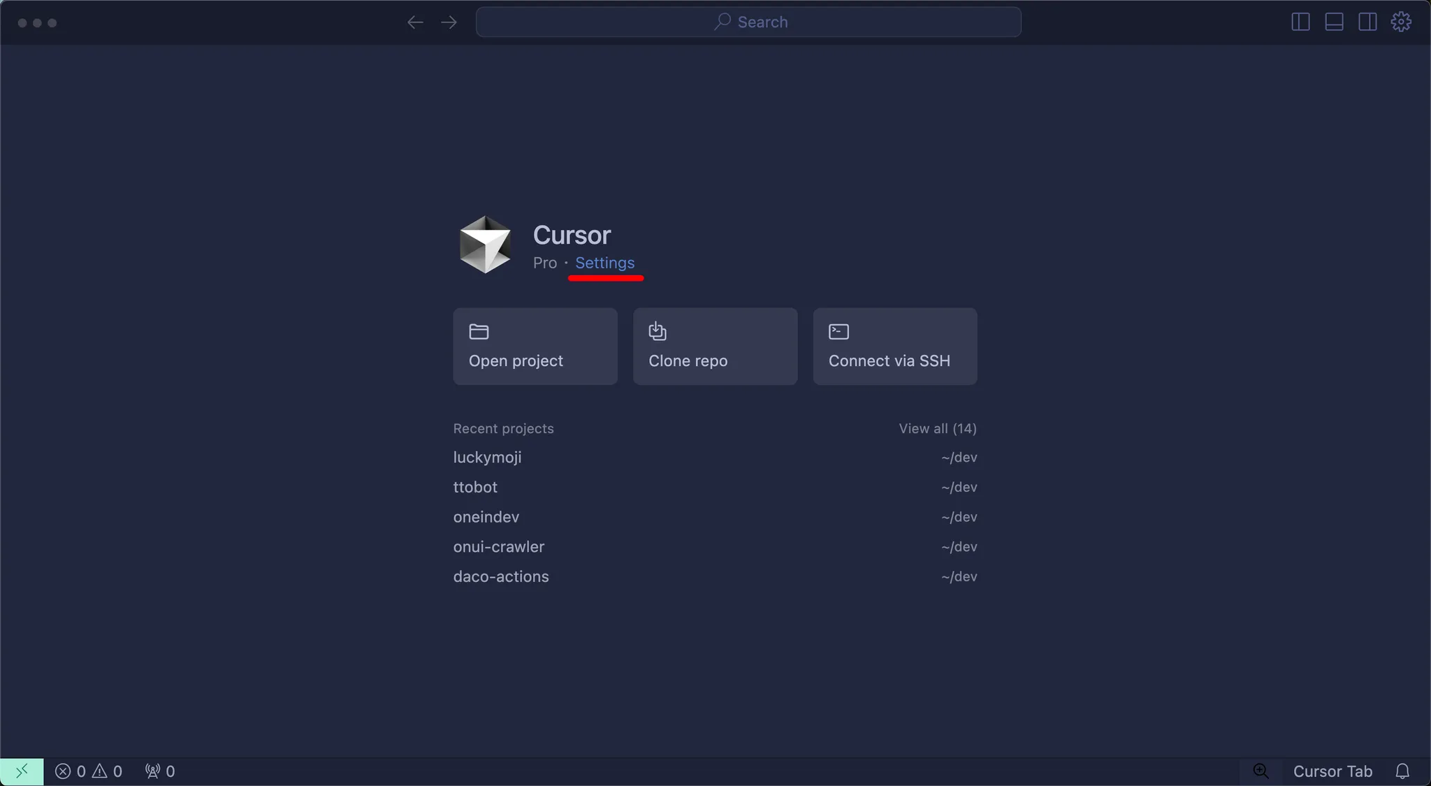 Cursor 를 설치했다면 실행 후 Settings 버튼을 눌러주세요.