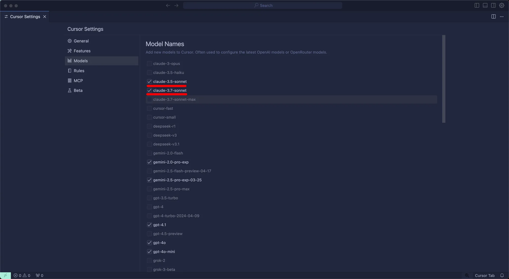 Models 메뉴에서 주로 사용할 LLM 모델을 선택할 수 있습니다. AI 개발자를 지정한다고 보시면 됩니다. 저는 주로 claude-3.5 도는 3.7 을 사용합니다. 체감상 claude 모델이 gpt 모델보다 코드 작성 실력이 높았습니다.