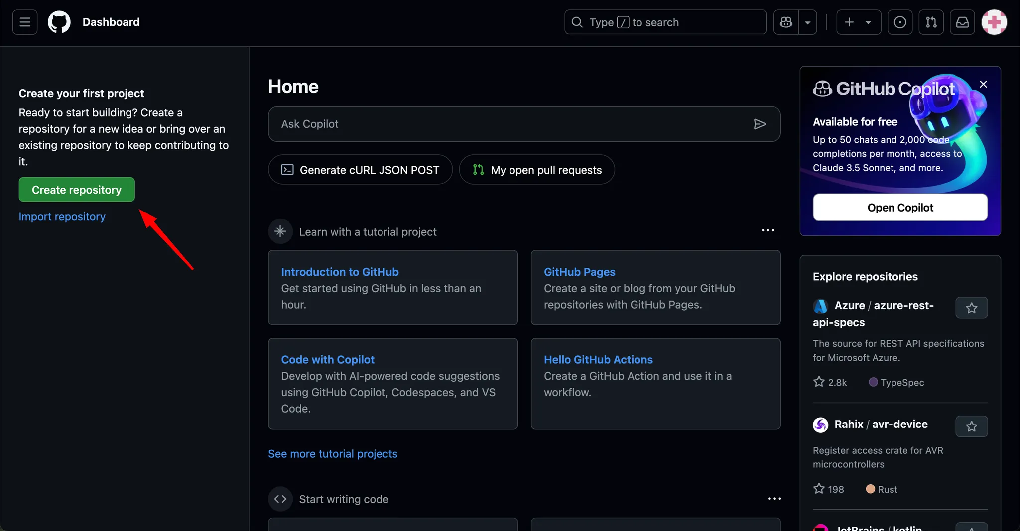 [Dashboard] 페이지에서 Create repository 버튼을 눌러 테스트로 레포지토리를 만들어보겠습니다.