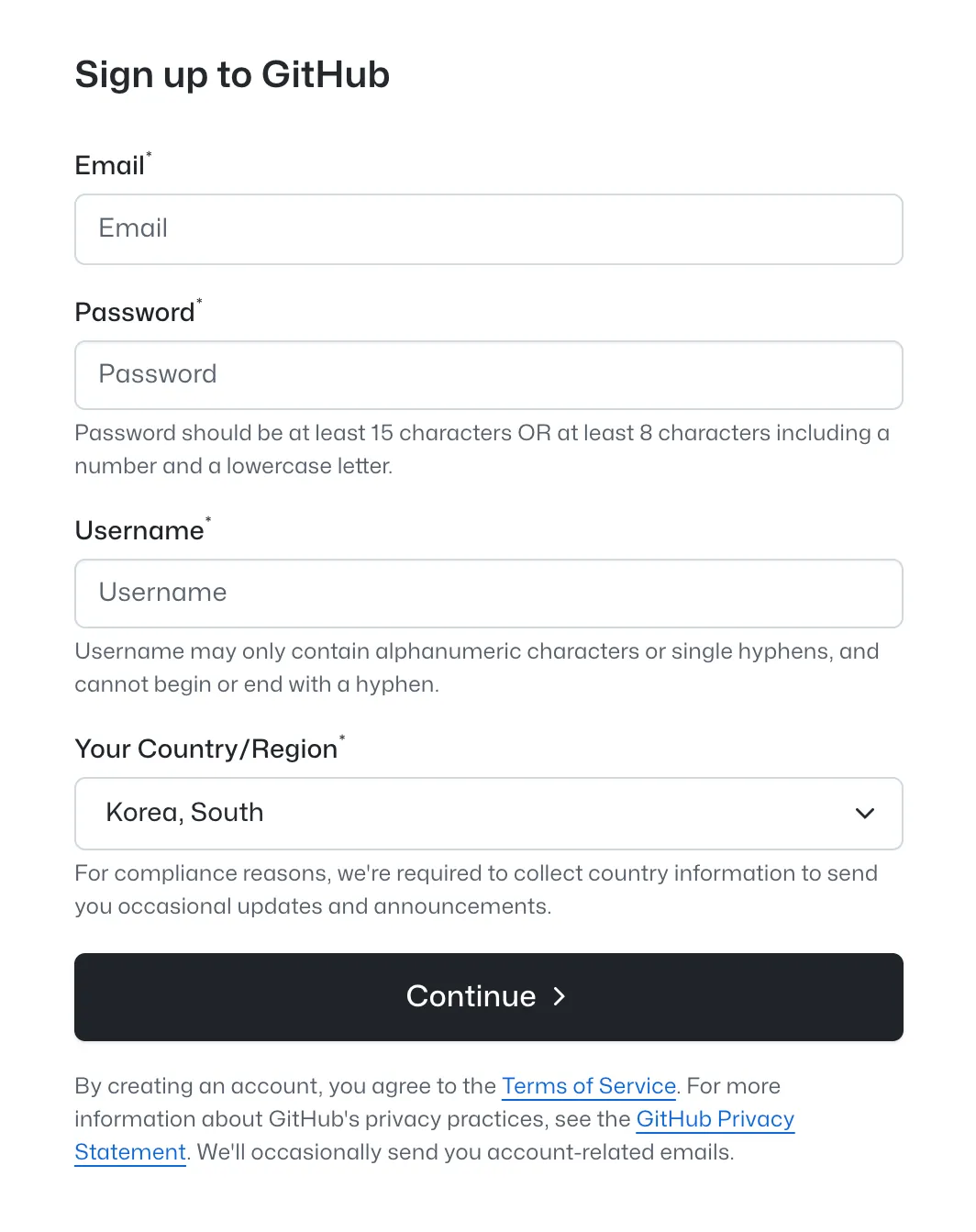 [Sign up to GitHub] 페이지에서 email, password, username 을 입력한 뒤 Continue 버튼을 눌러주세요.