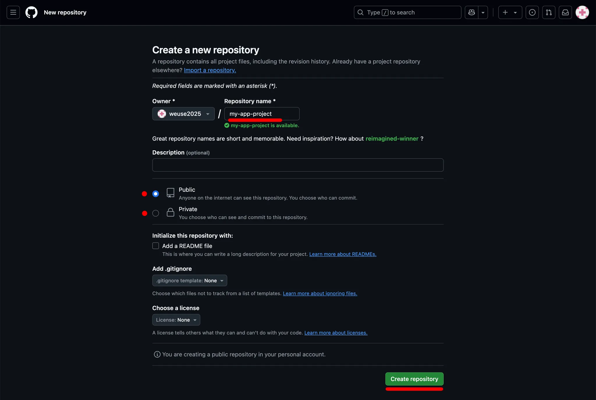 아래 이미지에서 빨간색으로 표시한 [Repository name]과 Public 또는 Private 을 선택한 후 Create repository 버튼을 눌러줍니다. (나머지 옵션은 그대로 두는 것을 권장합니다)