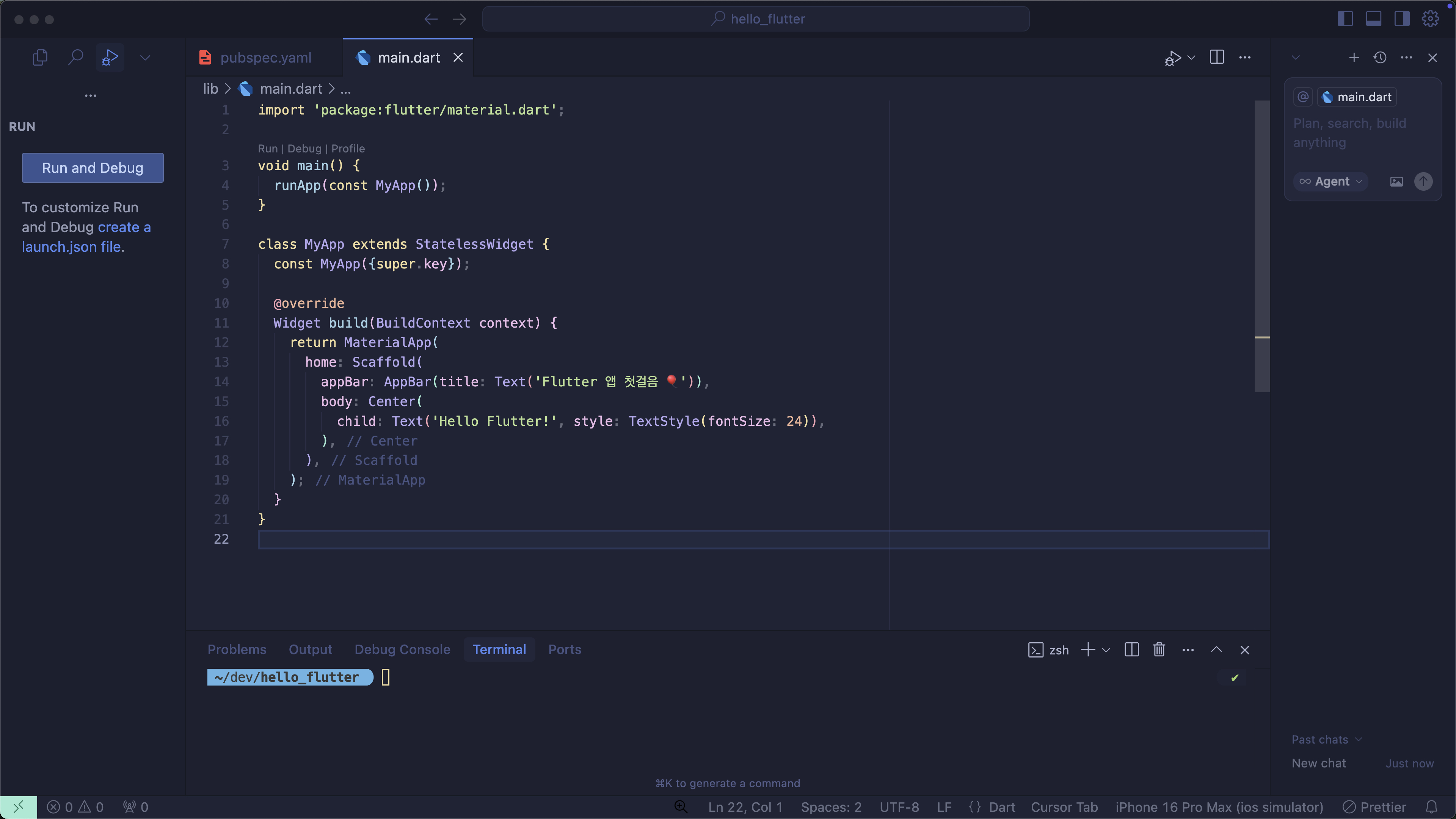 앱 실행은 터미널에 `flutter run` 명령어로 실행할 수도 있지만, 그보다는 새로고침과 디버깅이 쉬운 Run and Debug 로 실행하는 것을 추천해요. (Run and Debug 패널은 단축키 cmd + shift + d 로 열 수 있어요.)