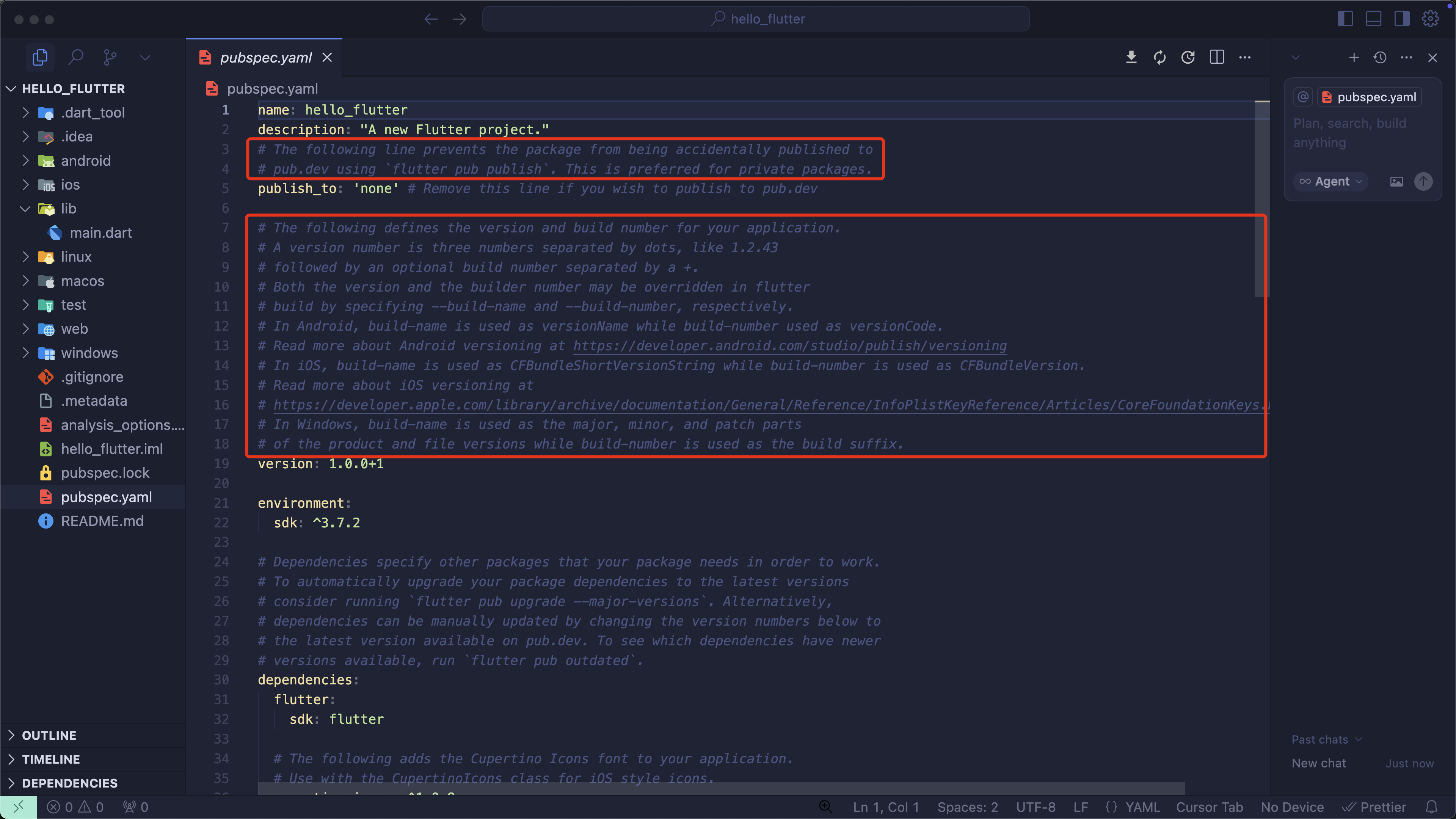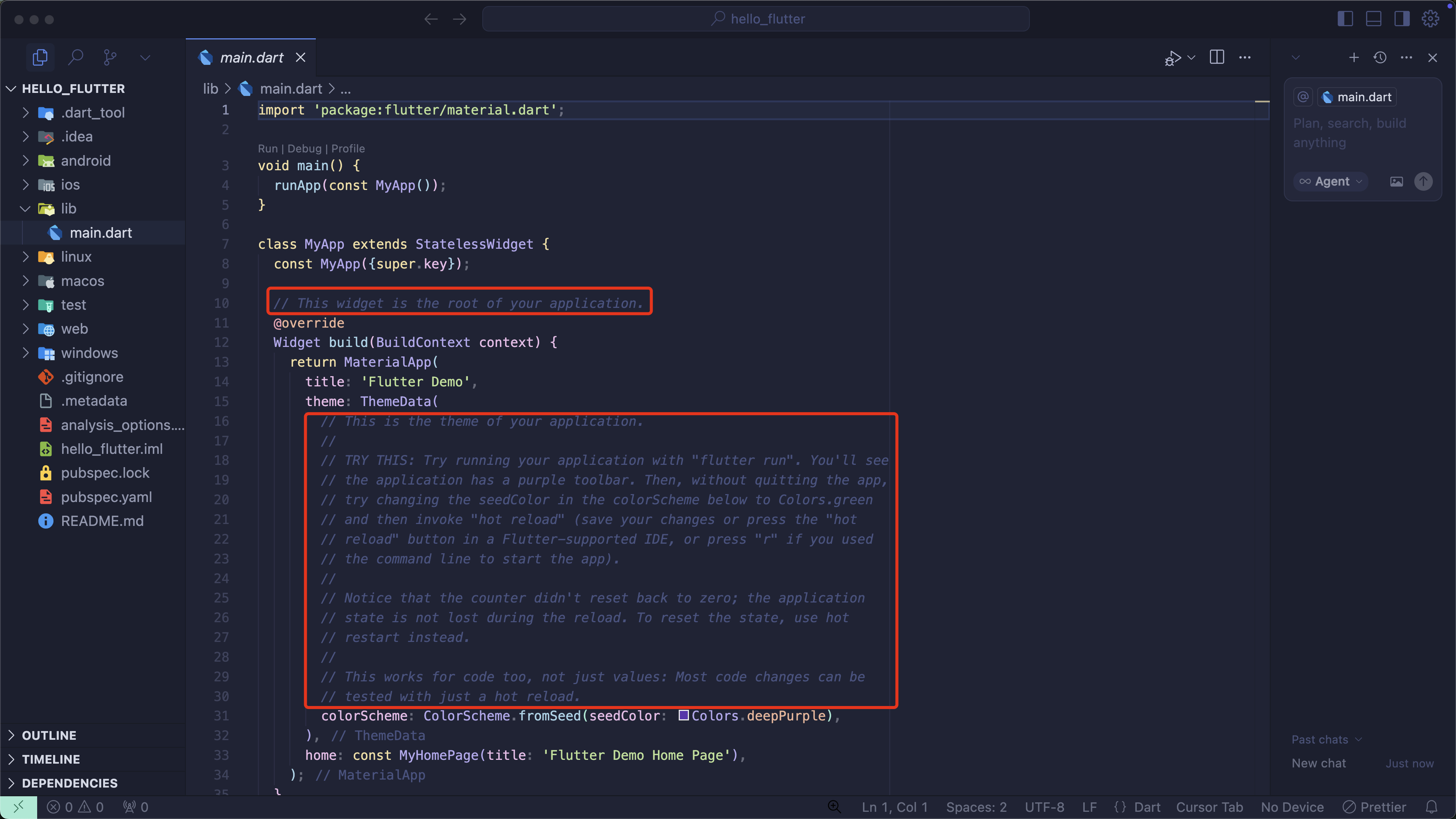 lib/main.dart 파일과 pubspec.yaml 파일로 이동해 주석들을 제거합니다. (주석이 너무 많아서 코드를 읽기가 어렵기 때문에 제거합니다)