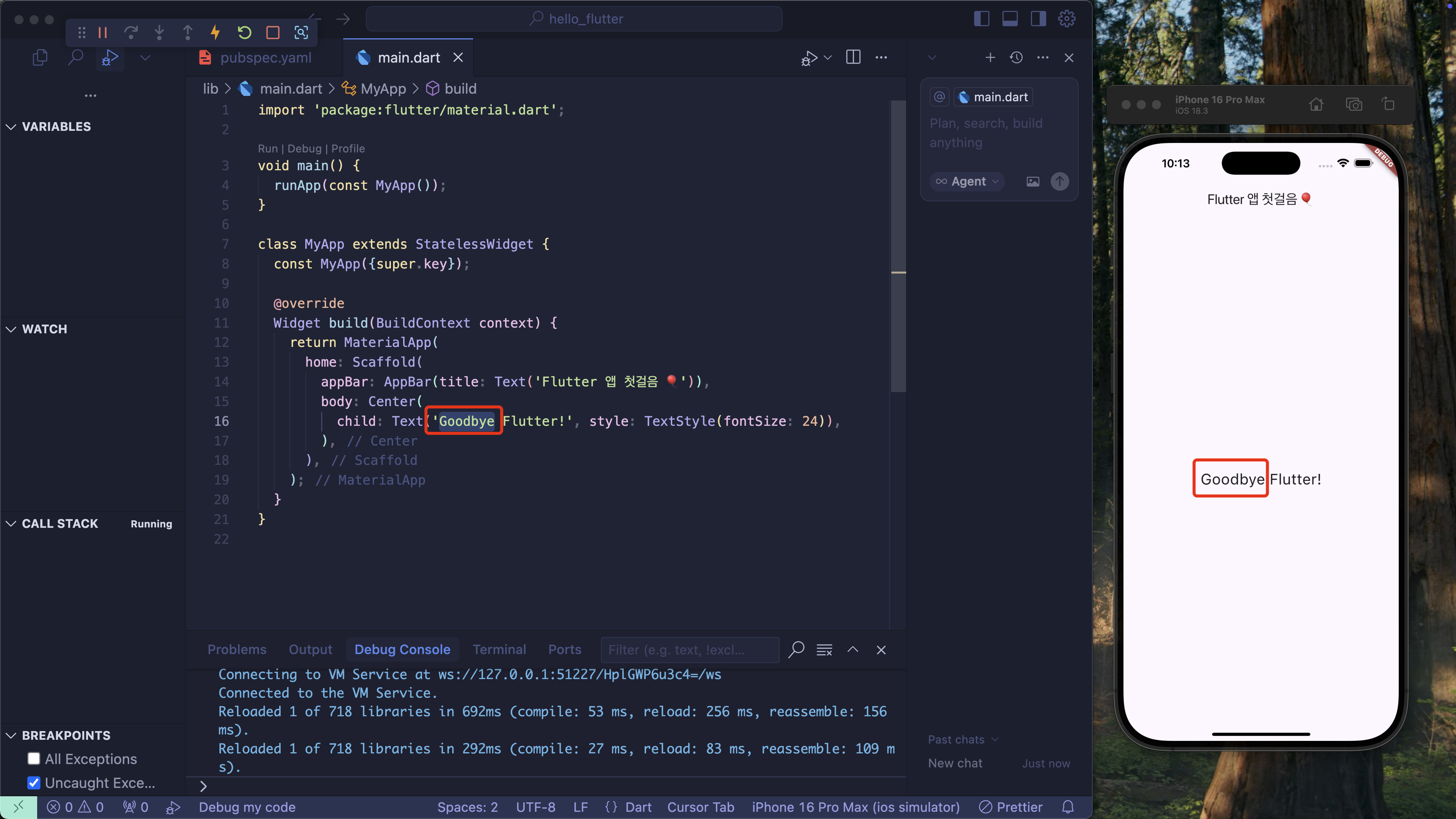 저장이 완료되면 우측 iOS 시뮬레이터에서도 수정 사항이 반영된 것을 확인할 수 있습니다.
