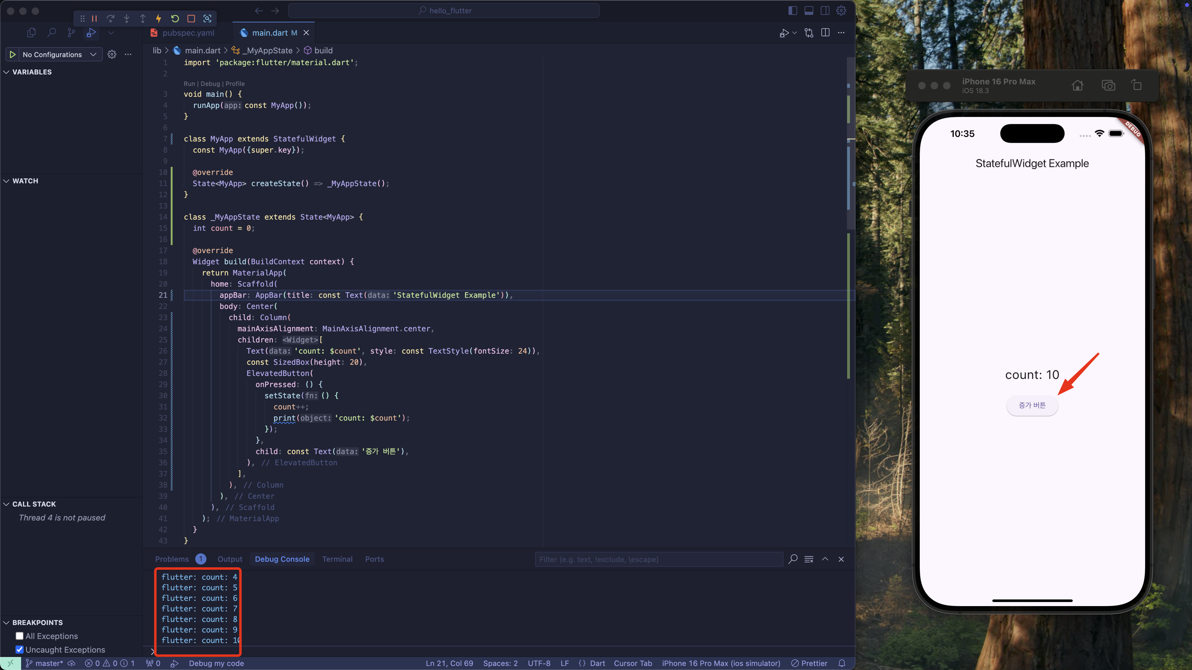 이번에는 증가 버튼을 누르니 변경된 count 값이 화면에도 반영되는 것을 확인할 수 있습니다. 이것은 setState() 를 통해 count 값 상태가 변경될 때마다 화면이 다시 그려지기 때문입니다.