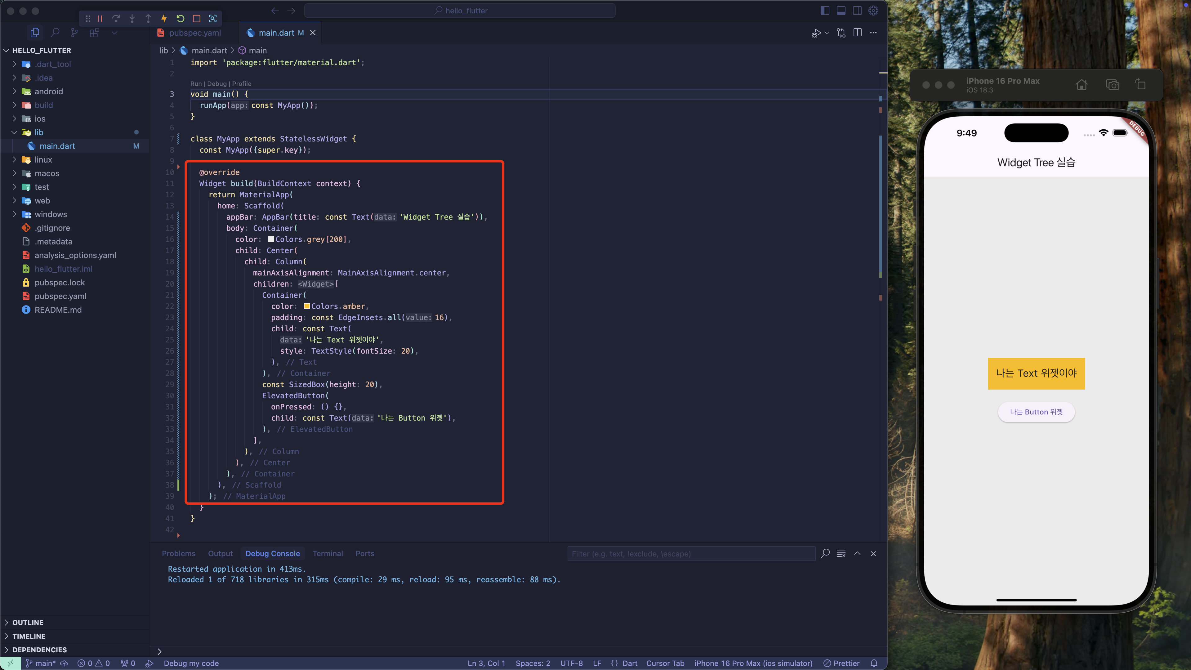 화면에 텍스트, 버튼, 박스 등을 여러 개 중첩시켜서 위젯 트리가 어떻게 쌓이는지 직접 확인해 보겠습니다.