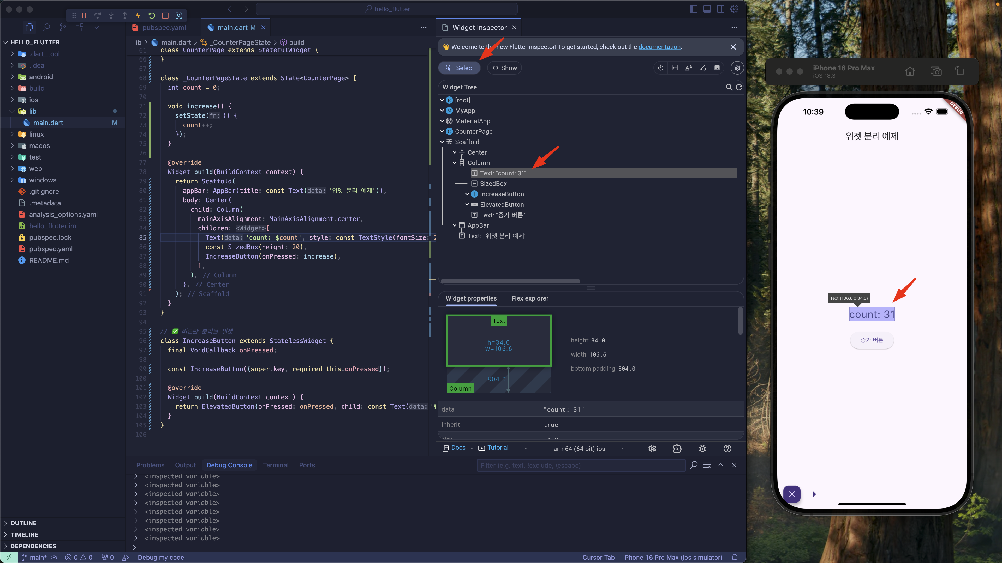 만약 위에 있는 Select 모드를 활성화하고 다시 Text 위젯을 선택하면 iOS 시뮬레이터에서 선택한 위젯을 화면에 표시해 줍니다. 이를 통해 화면에 그려진 위젯이 어떤 위젯인지 쉽게 찾을 수 있는 거죠.