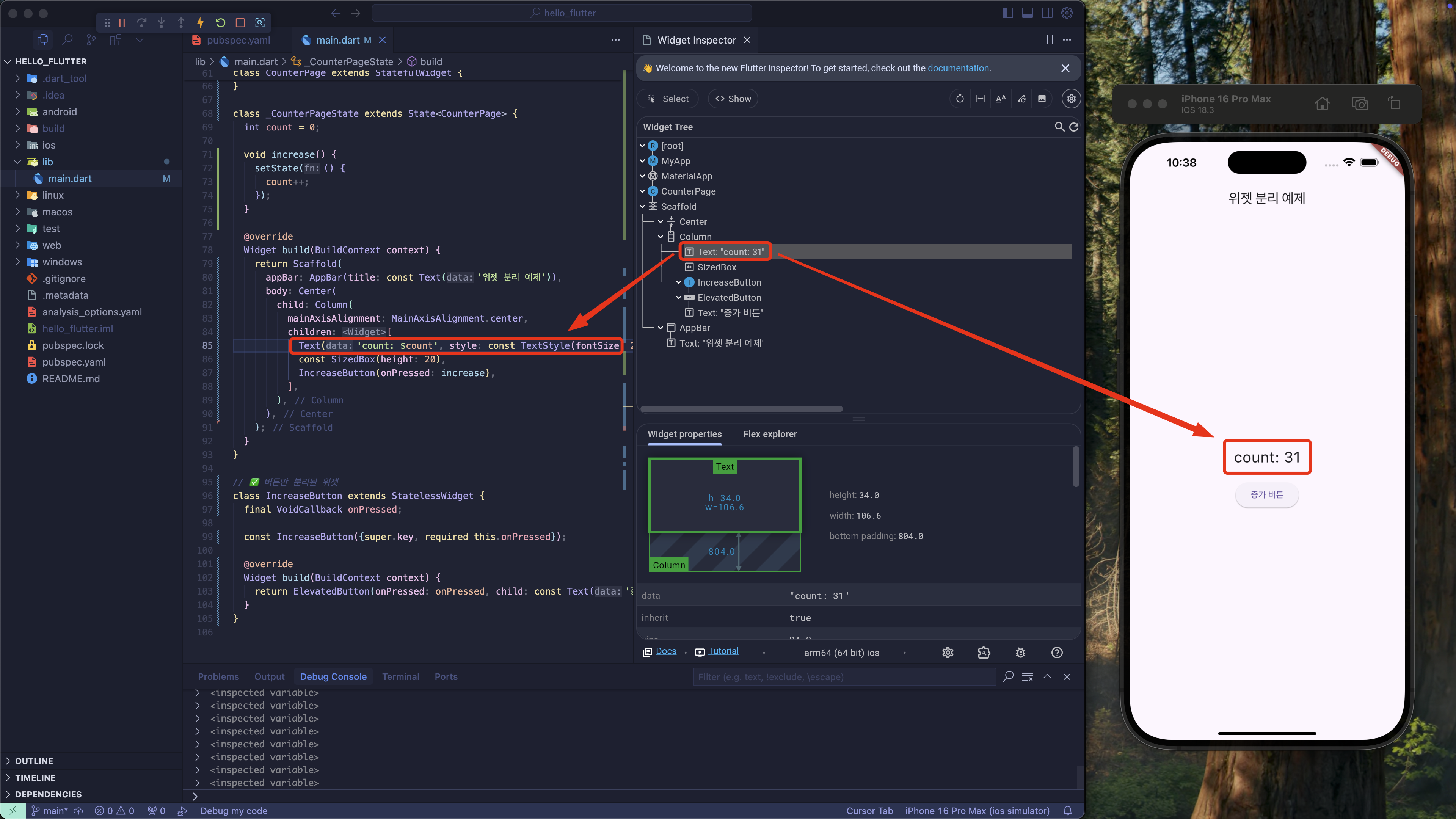 위 이미지는 count 를 표시하는 Text 위젯을 선택한 화면입니다. 우리가 배운 위젯 트리 구조가 보이시나요?