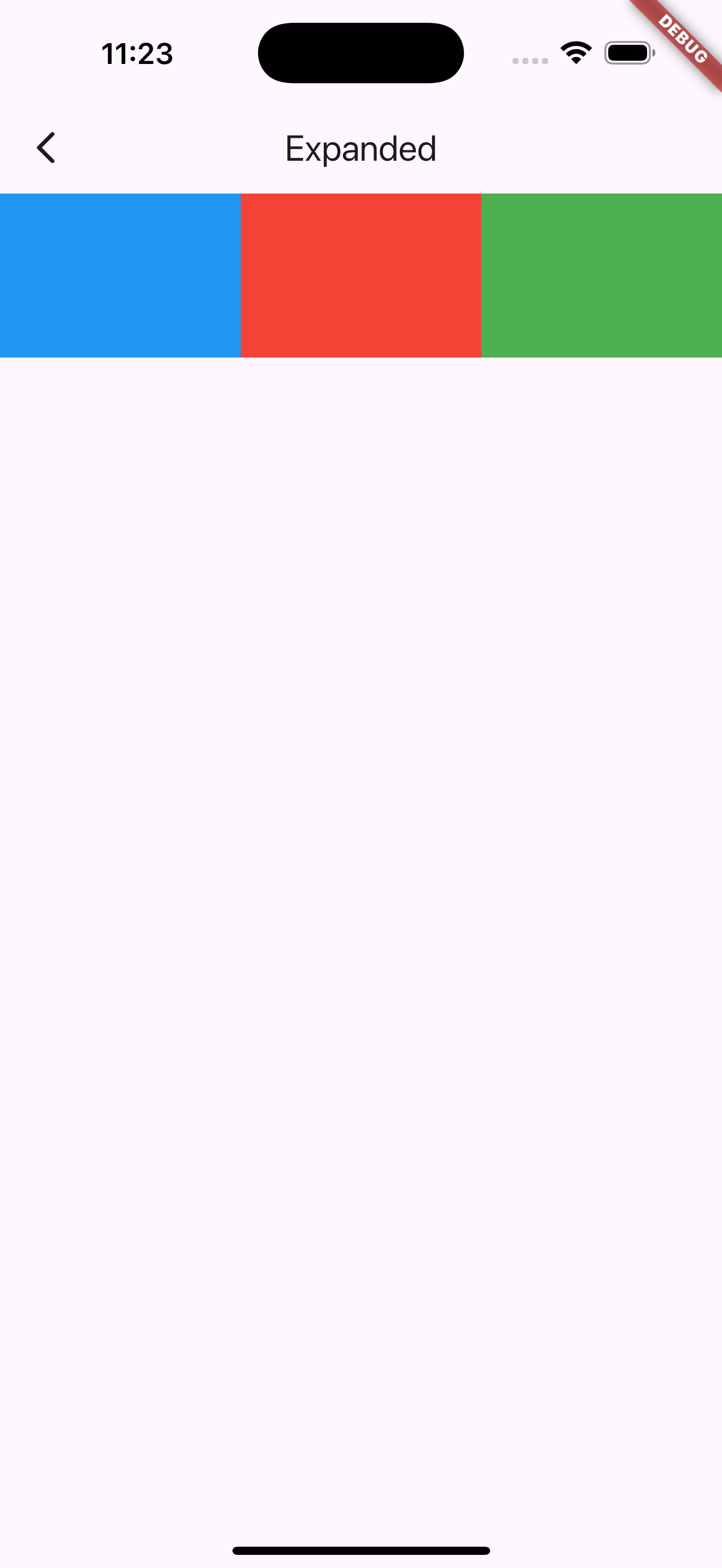 위 코드는 가로로 정렬된 자식 요소 blue, red, green 이 화면의 남은 공간을 채우는 코드입니다.