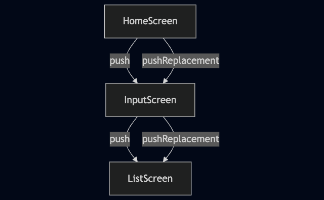 이와 달리, Navigator.pushReplacement( ... ) 는 InputScreen 으로 현재 화면을 새로운 화면으로 교체하며 이동합니다. HomeScreen이 남아있지 않기 때문에 뒤로 가기가 불가능합니다.