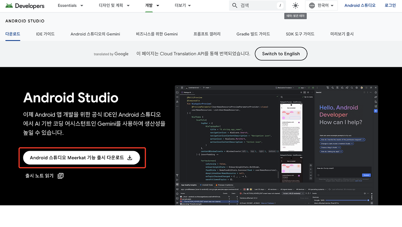 아래 링크를 통해 Android Studio 공식 다운로드 페이지로 이동합니다.