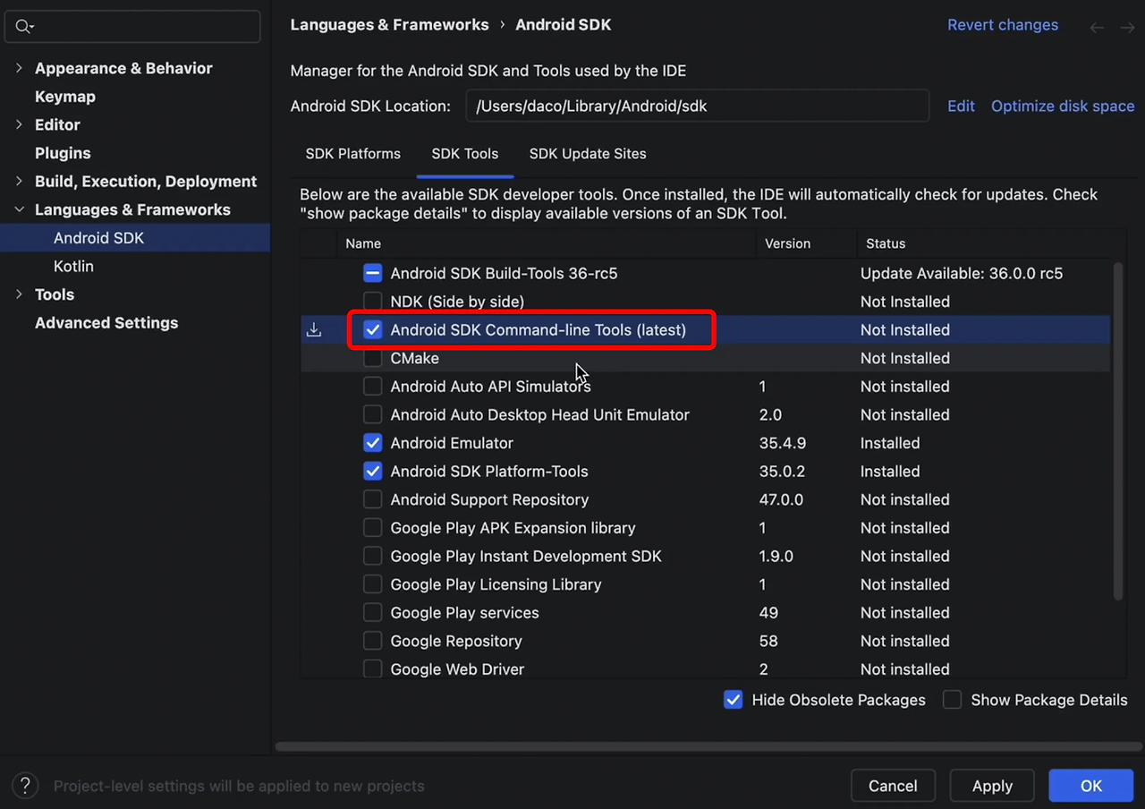 설치가 되었다면 Android SDK Location 영역에 경로가 표시됩니다.