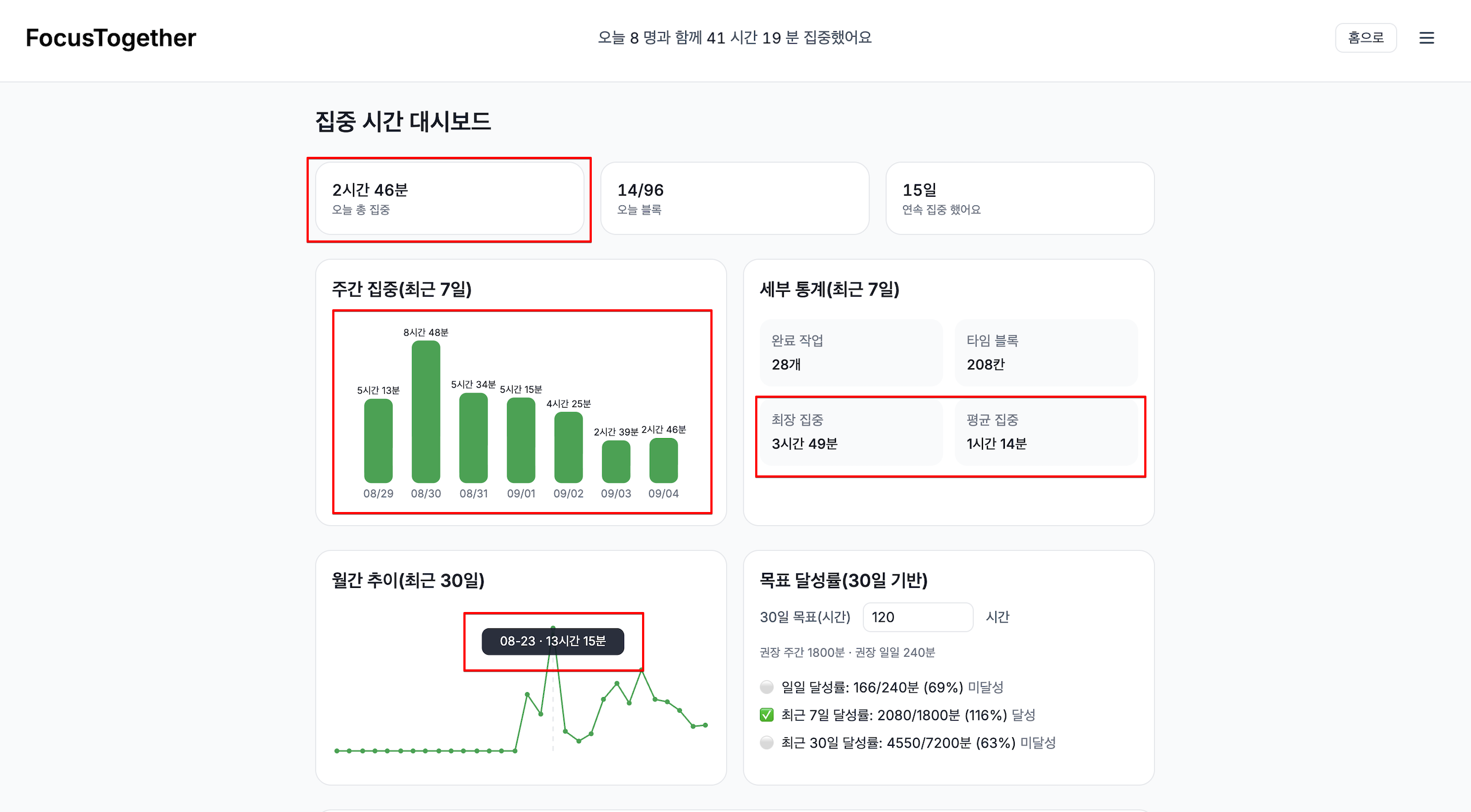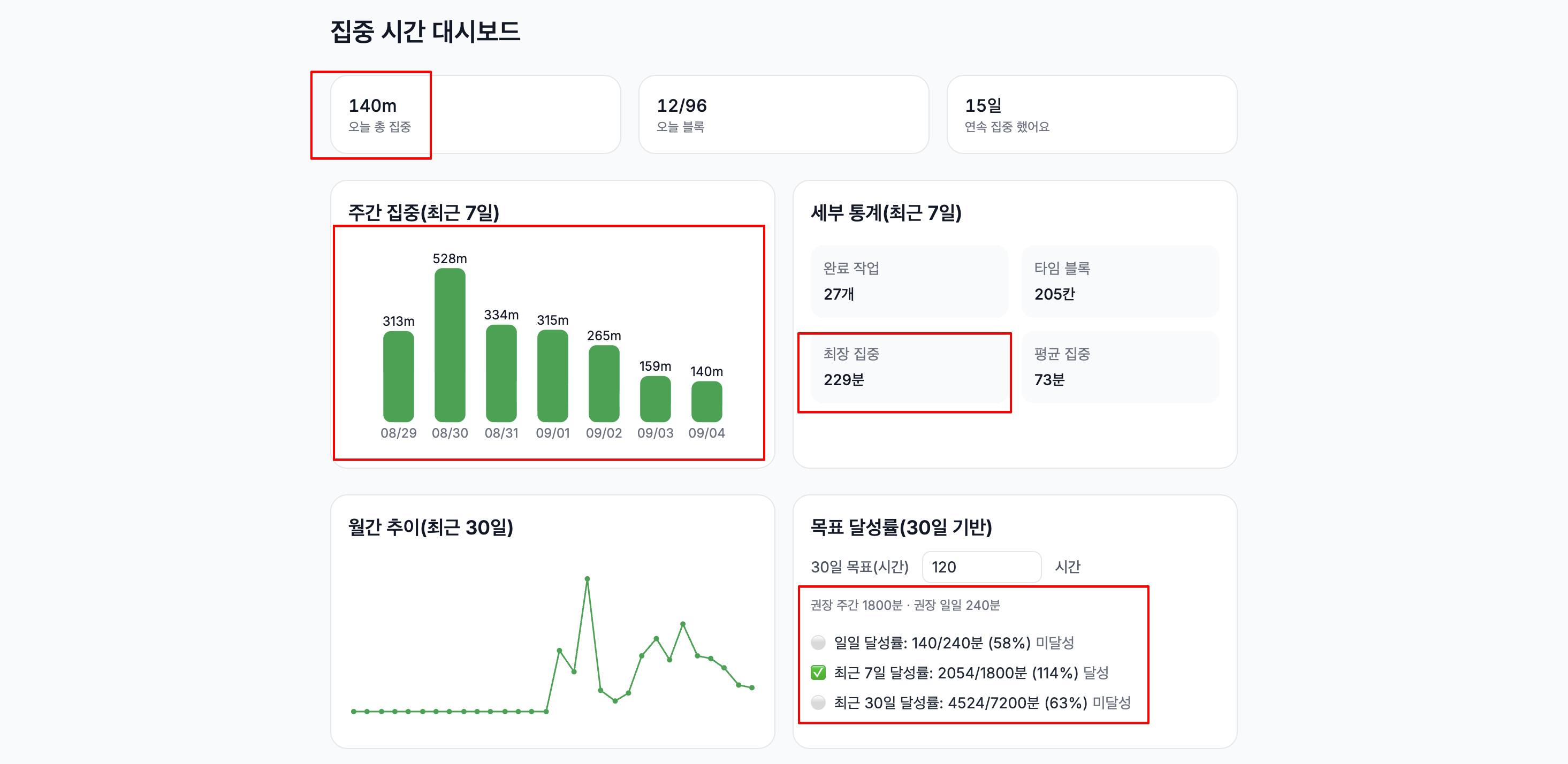 다만, 목표 달성률은 기존처럼 분 단위로 계산하도록 하였다. 목표 달성률은 시간을 분으로 쪼개서 일괄 나누는 방식이고 '시, 분' 단위로 표기했을 때에 텍스트 길이가 길어져 줄 바꿈이 일어나는 등 가독성이 떨어질 것을 우려한 결정이었다.