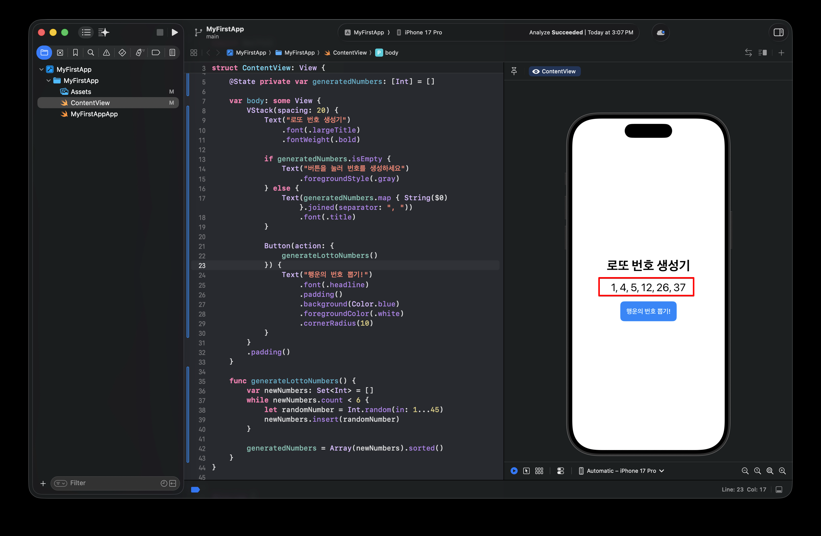 이 함수는 1부터 45 사이의 중복되지 않는 숫자 6개를 뽑아서 정렬한 뒤, @State 변수인 generatedNumbers에 그 결과를 저장(=)하는 역할을 합니다.